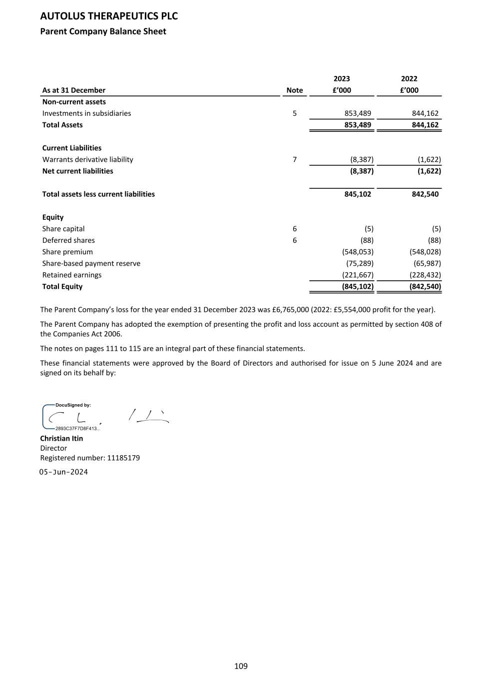 2023 2022 As at 31 December Note £’000 £’000 Non-current assets Investments in subsidiaries 5 853,489 844,162 Total Assets 853,489 844,162 Current Liabilities Warrants derivative liability 7 (8,387) (1,622) Net current liabilities (8,387) (1,622) Total assets less current liabilities 845,102 842,540 Equity Share capital 6 (5) (5) Deferred shares 6 (88) (88) Share premium (548,053) (548,028) Share-based payment reserve (75,289) (65,987) Retained earnings (221,667) (228,432) Total Equity (845,102) (842,540) The Parent Company’s loss for the year ended 31 December 2023 was £6,765,000 (2022: £5,554,000 profit for the year). The Parent Company has adopted the exemption of presenting the profit and loss account as permitted by section 408 of the Companies Act 2006. The notes on pages 111 to 115 are an integral part of these financial statements. These financial statements were approved by the Board of Directors and authorised for issue on 5 June 2024 and are signed on its behalf by: Christian Itin Director Registered number: 11185179 AUTOLUS THERAPEUTICS PLC Parent Company Balance Sheet 109 05-Jun-2024