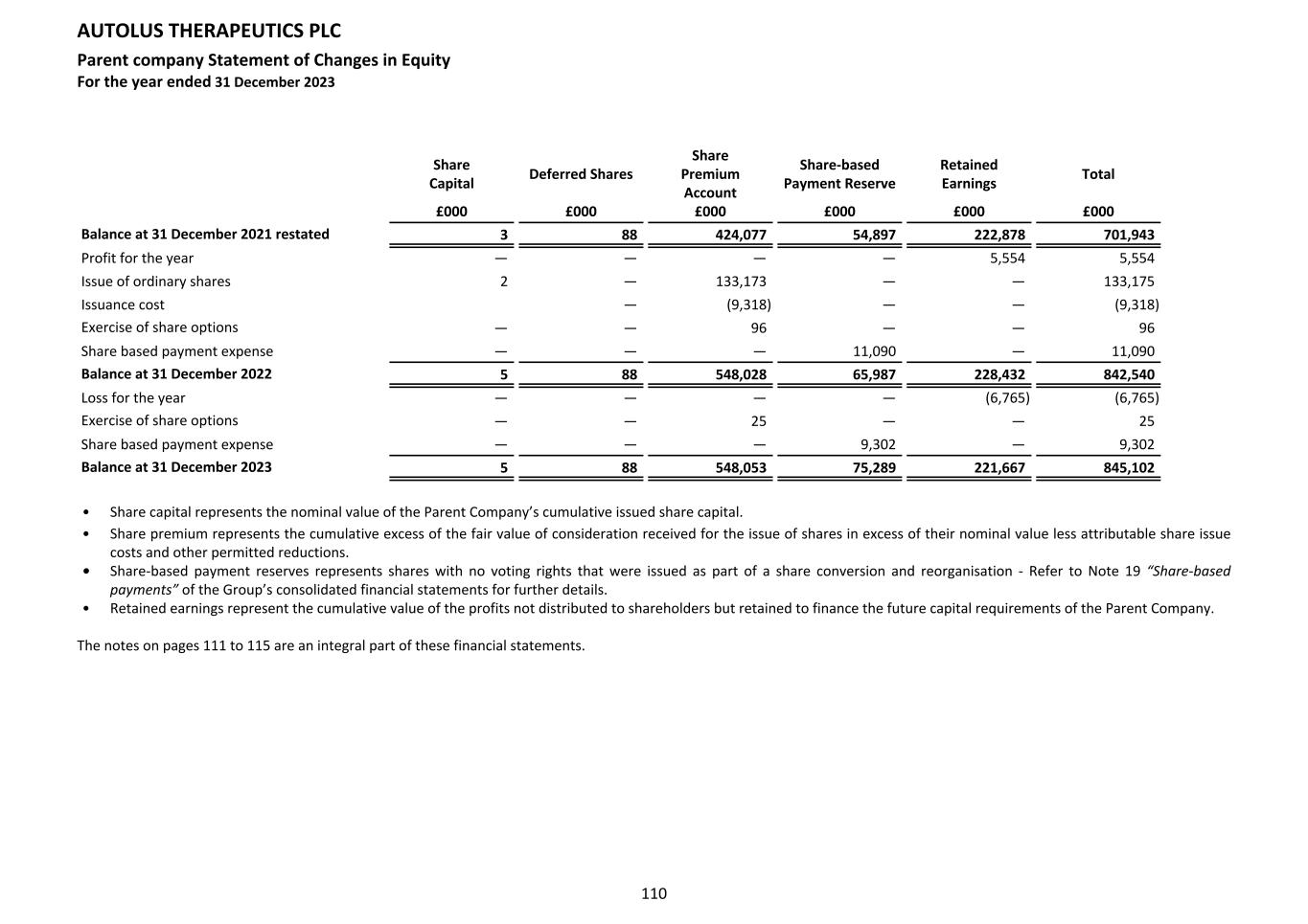 Share Capital Deferred Shares Share Premium Account Share-based Payment Reserve Retained Earnings Total £000 £000 £000 £000 £000 £000 Balance at 31 December 2021 restated 3 88 424,077 54,897 222,878 701,943 Profit for the year — — — — 5,554 5,554 Issue of ordinary shares 2 — 133,173 — — 133,175 Issuance cost — (9,318) — — (9,318) Exercise of share options — — 96 — — 96 Share based payment expense — — — 11,090 — 11,090 Balance at 31 December 2022 5 88 548,028 65,987 228,432 842,540 Loss for the year — — — — (6,765) (6,765) Exercise of share options — — 25 — — 25 Share based payment expense — — — 9,302 — 9,302 Balance at 31 December 2023 5 88 548,053 75,289 221,667 845,102 • Share capital represents the nominal value of the Parent Company’s cumulative issued share capital. • Share premium represents the cumulative excess of the fair value of consideration received for the issue of shares in excess of their nominal value less attributable share issue costs and other permitted reductions. • Share-based payment reserves represents shares with no voting rights that were issued as part of a share conversion and reorganisation - Refer to Note 19 “Share-based payments” of the Group’s consolidated financial statements for further details. • Retained earnings represent the cumulative value of the profits not distributed to shareholders but retained to finance the future capital requirements of the Parent Company. The notes on pages 111 to 115 are an integral part of these financial statements. AUTOLUS THERAPEUTICS PLC Parent company Statement of Changes in Equity For the year ended 31 December 2023 110