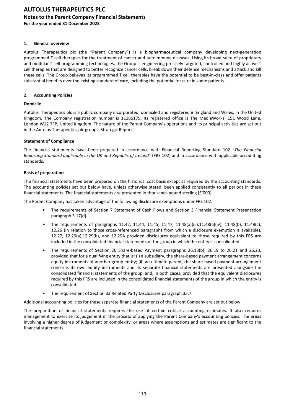 1. General overview Autolus Therapeutics plc (the “Parent Company”) is a biopharmaceutical company developing next-generation programmed T cell therapies for the treatment of cancer and autoimmune diseases. Using its broad suite of proprietary and modular T cell programming technologies, the Group is engineering precisely targeted, controlled and highly active T cell therapies that are designed to better recognize cancer cells, break down their defence mechanisms and attack and kill these cells. The Group believes its programmed T cell therapies have the potential to be best-in-class and offer patients substantial benefits over the existing standard of care, including the potential for cure in some patients. 2. Accounting Policies Domicile Autolus Therapeutics plc is a public company incorporated, domiciled and registered in England and Wales, in the United Kingdom. The Company registration number is 11185179. Its registered office is The MediaWorks, 191 Wood Lane, London W12 7FP, United Kingdom. The nature of the Parent Company’s operations and its principal activities are set out in the Autolus Therapeutics plc group’s Strategic Report. Statement of Compliance The financial statements have been prepared in accordance with Financial Reporting Standard 102 “The Financial Reporting Standard applicable in the UK and Republic of Ireland” (FRS 102) and in accordance with applicable accounting standards. Basis of preparation The financial statements have been prepared on the historical cost basis except as required by the accounting standards. The accounting policies set out below have, unless otherwise stated, been applied consistently to all periods in these financial statements. The financial statements are presented in thousands pound sterling (£'000). The Parent Company has taken advantage of the following disclosure exemptions under FRS 102: • The requirements of Section 7 Statement of Cash Flows and Section 3 Financial Statement Presentation paragraph 3.17(d). • The requirements of paragraphs 11.42, 11.44, 11.45, 11.47, 11.48(a)(iii),11.48(a)(iv), 11.48(b), 11.48(c), 12.26 (in relation to those cross-referenced paragraphs from which a disclosure exemption is available), 12.27, 12.29(a),12.29(b), and 12.29A provided disclosures equivalent to those required by this FRS are included in the consolidated financial statements of the group in which the entity is consolidated. • The requirements of Section 26 Share-based Payment paragraphs 26.18(b), 26.19 to 26.21 and 26.23, provided that for a qualifying entity that is: (i) a subsidiary, the share-based payment arrangement concerns equity instruments of another group entity; (ii) an ultimate parent, the share-based payment arrangement concerns its own equity instruments and its separate financial statements are presented alongside the consolidated financial statements of the group; and, in both cases, provided that the equivalent disclosures required by this FRS are included in the consolidated financial statements of the group in which the entity is consolidated. • The requirement of Section 33 Related Party Disclosures paragraph 33.7. Additional accounting policies for these separate financial statements of the Parent Company are set out below. The preparation of financial statements requires the use of certain critical accounting estimates. It also requires management to exercise its judgement in the process of applying the Parent Company’s accounting policies. The areas involving a higher degree of judgement or complexity, or areas where assumptions and estimates are significant to the financial statements. AUTOLUS THERAPEUTICS PLC Notes to the Parent Company Financial Statements For the year ended 31 December 2023 111
