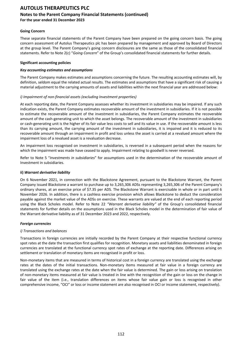 Going Concern These separate financial statements of the Parent Company have been prepared on the going concern basis. The going concern assessment of Autolus Therapeutics plc has been prepared by management and approved by Board of Directors at the group level. The Parent Company’s going concern disclosures are the same as those of the consolidated financial statements. Refer to Note 2(c) “Going Concern” of the Group’s consolidated financial statements for further details. Significant accounting policies Key accounting estimates and assumptions The Parent Company makes estimates and assumptions concerning the future. The resulting accounting estimates will, by definition, seldom equal the related actual results. The estimates and assumptions that have a significant risk of causing a material adjustment to the carrying amounts of assets and liabilities within the next financial year are addressed below: i) Impairment of non-financial assets (excluding Investment properties) At each reporting date, the Parent Company assesses whether its investment in subsidiaries may be impaired. If any such indication exists, the Parent Company estimates recoverable amount of the investment in subsidiaries. If it is not possible to estimate the recoverable amount of the investment in subsidiaries, the Parent Company estimates the recoverable amount of the cash-generating unit to which the asset belongs. The recoverable amount of the investment in subsidiaries or cash-generating unit is the higher of its fair value less costs to sell and its value in use. If the recoverable amount is less than its carrying amount, the carrying amount of the investment in subsidiaries, it is impaired and it is reduced to its recoverable amount through an impairment in profit and loss unless the asset is carried at a revalued amount where the impairment loss of a revalued asset is a revaluation decrease. An impairment loss recognised on investment in subsidiaries, is reversed in a subsequent period when the reasons for which the impairment was made have ceased to apply. Impairment relating to goodwill is never reversed. Refer to Note 5 “Investments in subsidiaries” for assumptions used in the determination of the recoverable amount of Investment in subsidiaries. ii) Warrant derivative liability On 6 November 2021, in connection with the Blackstone Agreement, pursuant to the Blackstone Warrant, the Parent Company issued Blackstone a warrant to purchase up to 3,265,306 ADSs representing 3,265,306 of the Parent Company’s ordinary shares, at an exercise price of $7.35 per ADS. The Blackstone Warrant is exercisable in whole or in part until 6 November 2026. In addition, there is a cashless exercise provision which allows Blackstone to deduct the consideration payable against the market value of the ADSs on exercise. These warrants are valued at the end of each reporting period using the Black Scholes model. Refer to Note 22 “Warrant derivative liability” of the Group’s consolidated financial statements for further details on the assumptions used in the Black Scholes model in the determination of fair value of the Warrant derivative liability as of 31 December 2023 and 2022, respectively. Foreign currencies i) Transactions and balances Transactions in foreign currencies are initially recorded by the Parent Company at their respective functional currency spot rates at the date the transaction first qualifies for recognition. Monetary assets and liabilities denominated in foreign currencies are translated at the functional currency spot rates of exchange at the reporting date. Differences arising on settlement or translation of monetary items are recognised in profit or loss. Non-monetary items that are measured in terms of historical cost in a foreign currency are translated using the exchange rates at the dates of the initial transactions. Non-monetary items measured at fair value in a foreign currency are translated using the exchange rates at the date when the fair value is determined. The gain or loss arising on translation of non-monetary items measured at fair value is treated in line with the recognition of the gain or loss on the change in fair value of the item (i.e., translation differences on items whose fair value gain or loss is recognised in other comprehensive income, “OCI” or loss or income statement are also recognised in OCI or income statement, respectively). AUTOLUS THERAPEUTICS PLC Notes to the Parent Company Financial Statements (continued) For the year ended 31 December 2023 112