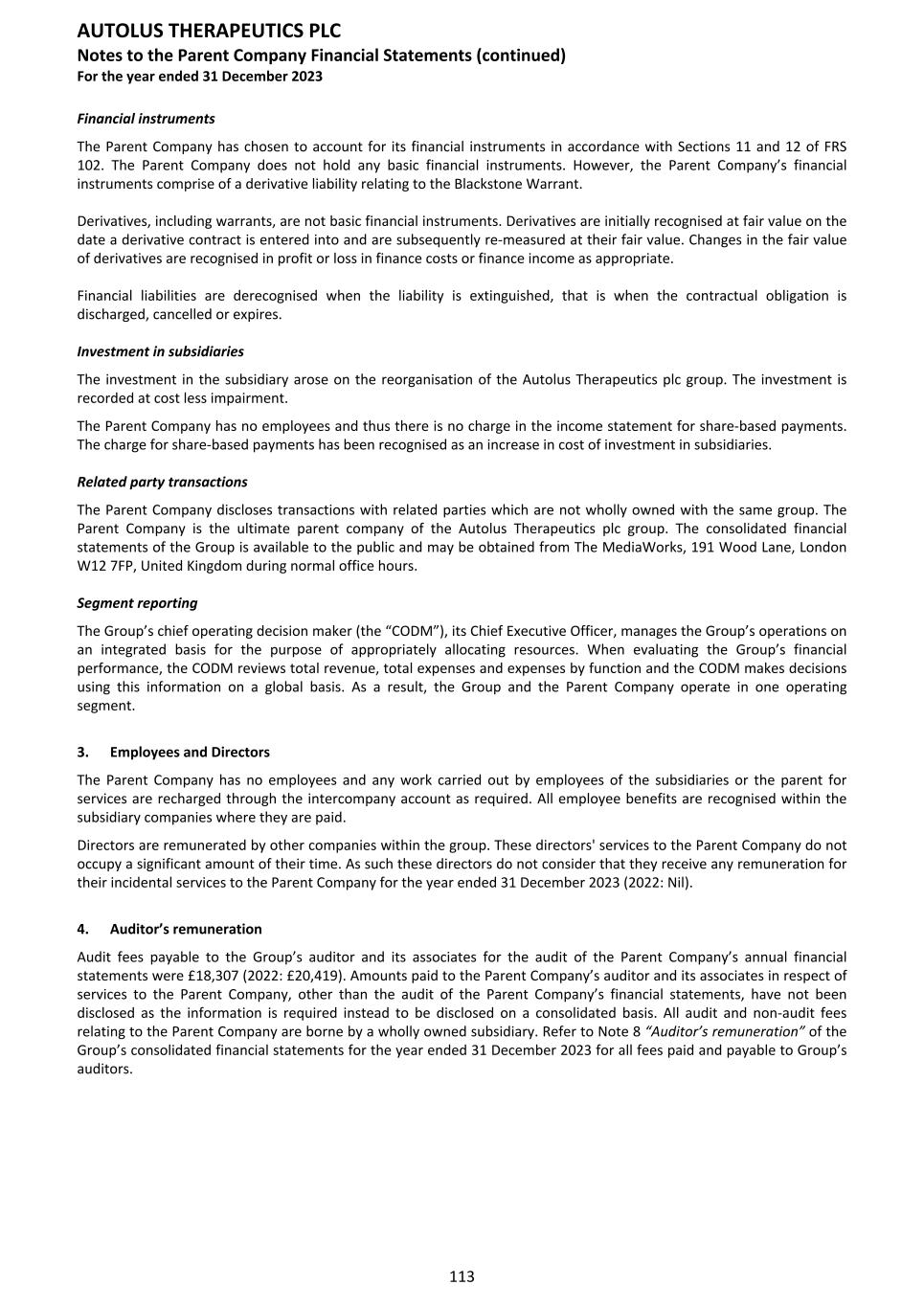 Financial instruments The Parent Company has chosen to account for its financial instruments in accordance with Sections 11 and 12 of FRS 102. The Parent Company does not hold any basic financial instruments. However, the Parent Company’s financial instruments comprise of a derivative liability relating to the Blackstone Warrant. Derivatives, including warrants, are not basic financial instruments. Derivatives are initially recognised at fair value on the date a derivative contract is entered into and are subsequently re-measured at their fair value. Changes in the fair value of derivatives are recognised in profit or loss in finance costs or finance income as appropriate. Financial liabilities are derecognised when the liability is extinguished, that is when the contractual obligation is discharged, cancelled or expires. Investment in subsidiaries The investment in the subsidiary arose on the reorganisation of the Autolus Therapeutics plc group. The investment is recorded at cost less impairment. The Parent Company has no employees and thus there is no charge in the income statement for share-based payments. The charge for share-based payments has been recognised as an increase in cost of investment in subsidiaries. Related party transactions The Parent Company discloses transactions with related parties which are not wholly owned with the same group. The Parent Company is the ultimate parent company of the Autolus Therapeutics plc group. The consolidated financial statements of the Group is available to the public and may be obtained from The MediaWorks, 191 Wood Lane, London W12 7FP, United Kingdom during normal office hours. Segment reporting The Group’s chief operating decision maker (the “CODM”), its Chief Executive Officer, manages the Group’s operations on an integrated basis for the purpose of appropriately allocating resources. When evaluating the Group’s financial performance, the CODM reviews total revenue, total expenses and expenses by function and the CODM makes decisions using this information on a global basis. As a result, the Group and the Parent Company operate in one operating segment. 3. Employees and Directors The Parent Company has no employees and any work carried out by employees of the subsidiaries or the parent for services are recharged through the intercompany account as required. All employee benefits are recognised within the subsidiary companies where they are paid. Directors are remunerated by other companies within the group. These directors' services to the Parent Company do not occupy a significant amount of their time. As such these directors do not consider that they receive any remuneration for their incidental services to the Parent Company for the year ended 31 December 2023 (2022: Nil). 4. Auditor’s remuneration Audit fees payable to the Group’s auditor and its associates for the audit of the Parent Company’s annual financial statements were £18,307 (2022: £20,419). Amounts paid to the Parent Company’s auditor and its associates in respect of services to the Parent Company, other than the audit of the Parent Company’s financial statements, have not been disclosed as the information is required instead to be disclosed on a consolidated basis. All audit and non-audit fees relating to the Parent Company are borne by a wholly owned subsidiary. Refer to Note 8 “Auditor’s remuneration” of the Group’s consolidated financial statements for the year ended 31 December 2023 for all fees paid and payable to Group’s auditors. AUTOLUS THERAPEUTICS PLC Notes to the Parent Company Financial Statements (continued) For the year ended 31 December 2023 113