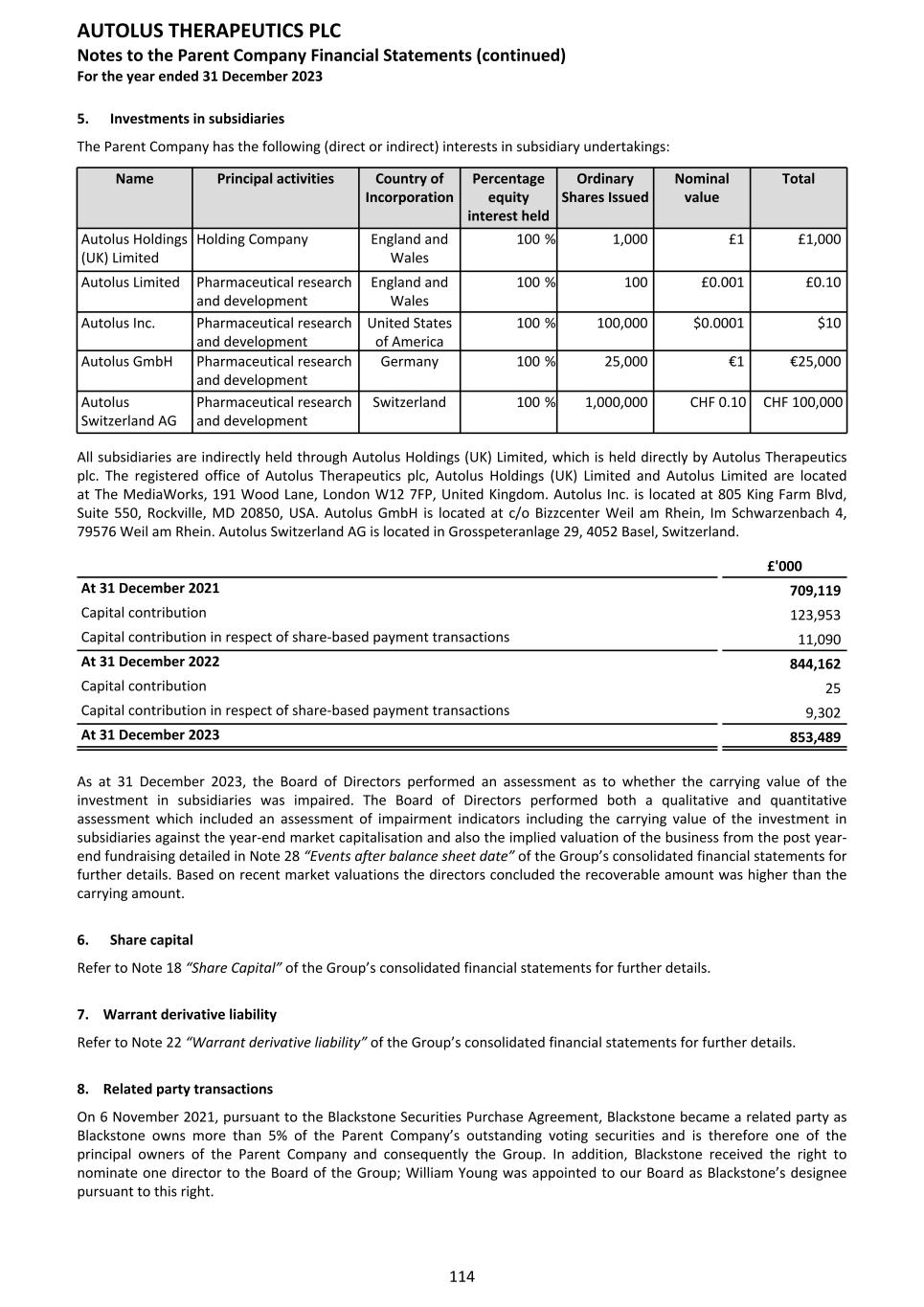 5. Investments in subsidiaries The Parent Company has the following (direct or indirect) interests in subsidiary undertakings: Name Principal activities Country of Incorporation Percentage equity interest held Ordinary Shares Issued Nominal value Total Autolus Holdings (UK) Limited Holding Company England and Wales 100 % 1,000 £1 £1,000 Autolus Limited Pharmaceutical research and development England and Wales 100 % 100 £0.001 £0.10 Autolus Inc. Pharmaceutical research and development United States of America 100 % 100,000 $0.0001 $10 Autolus GmbH Pharmaceutical research and development Germany 100 % 25,000 €1 €25,000 Autolus Switzerland AG Pharmaceutical research and development Switzerland 100 % 1,000,000 CHF 0.10 CHF 100,000 All subsidiaries are indirectly held through Autolus Holdings (UK) Limited, which is held directly by Autolus Therapeutics plc. The registered office of Autolus Therapeutics plc, Autolus Holdings (UK) Limited and Autolus Limited are located at The MediaWorks, 191 Wood Lane, London W12 7FP, United Kingdom. Autolus Inc. is located at 805 King Farm Blvd, Suite 550, Rockville, MD 20850, USA. Autolus GmbH is located at c/o Bizzcenter Weil am Rhein, Im Schwarzenbach 4, 79576 Weil am Rhein. Autolus Switzerland AG is located in Grosspeteranlage 29, 4052 Basel, Switzerland. £'000 At 31 December 2021 709,119 Capital contribution 123,953 Capital contribution in respect of share-based payment transactions 11,090 At 31 December 2022 844,162 Capital contribution 25 Capital contribution in respect of share-based payment transactions 9,302 At 31 December 2023 853,489 As at 31 December 2023, the Board of Directors performed an assessment as to whether the carrying value of the investment in subsidiaries was impaired. The Board of Directors performed both a qualitative and quantitative assessment which included an assessment of impairment indicators including the carrying value of the investment in subsidiaries against the year-end market capitalisation and also the implied valuation of the business from the post year- end fundraising detailed in Note 28 “Events after balance sheet date” of the Group’s consolidated financial statements for further details. Based on recent market valuations the directors concluded the recoverable amount was higher than the carrying amount. 6. Share capital Refer to Note 18 “Share Capital” of the Group’s consolidated financial statements for further details. 7. Warrant derivative liability Refer to Note 22 “Warrant derivative liability” of the Group’s consolidated financial statements for further details. 8. Related party transactions On 6 November 2021, pursuant to the Blackstone Securities Purchase Agreement, Blackstone became a related party as Blackstone owns more than 5% of the Parent Company’s outstanding voting securities and is therefore one of the principal owners of the Parent Company and consequently the Group. In addition, Blackstone received the right to nominate one director to the Board of the Group; William Young was appointed to our Board as Blackstone’s designee pursuant to this right. AUTOLUS THERAPEUTICS PLC Notes to the Parent Company Financial Statements (continued) For the year ended 31 December 2023 114