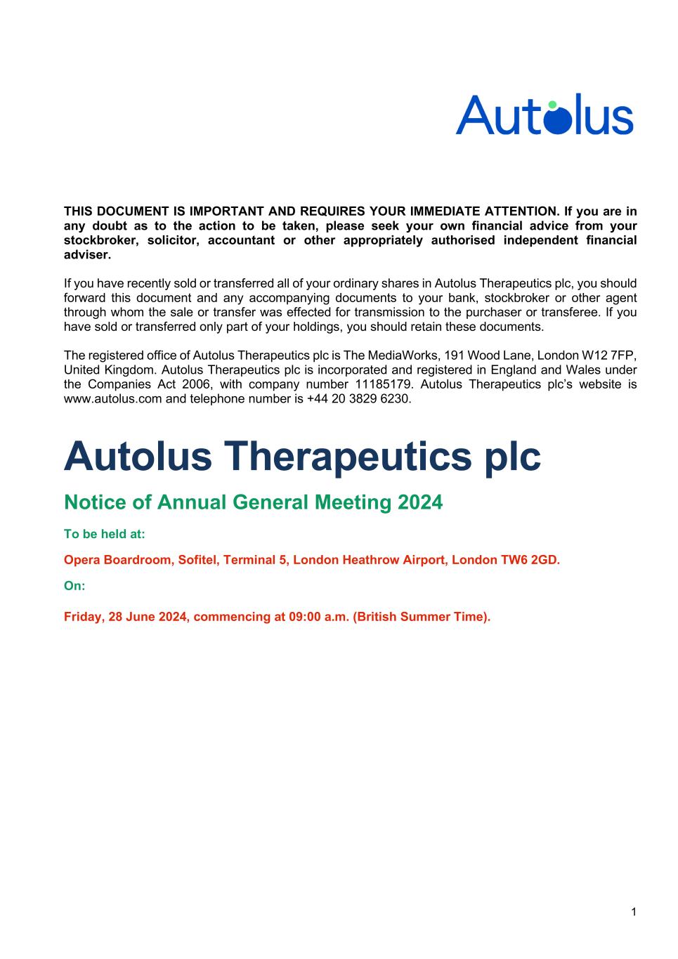 1 THIS DOCUMENT IS IMPORTANT AND REQUIRES YOUR IMMEDIATE ATTENTION. If you are in any doubt as to the action to be taken, please seek your own financial advice from your stockbroker, solicitor, accountant or other appropriately authorised independent financial adviser. If you have recently sold or transferred all of your ordinary shares in Autolus Therapeutics plc, you should forward this document and any accompanying documents to your bank, stockbroker or other agent through whom the sale or transfer was effected for transmission to the purchaser or transferee. If you have sold or transferred only part of your holdings, you should retain these documents. The registered office of Autolus Therapeutics plc is The MediaWorks, 191 Wood Lane, London W12 7FP, United Kingdom. Autolus Therapeutics plc is incorporated and registered in England and Wales under the Companies Act 2006, with company number 11185179. Autolus Therapeutics plc’s website is www.autolus.com and telephone number is +44 20 3829 6230. Autolus Therapeutics plc Notice of Annual General Meeting 2024 To be held at: Opera Boardroom, Sofitel, Terminal 5, London Heathrow Airport, London TW6 2GD. On: Friday, 28 June 2024, commencing at 09:00 a.m. (British Summer Time).
