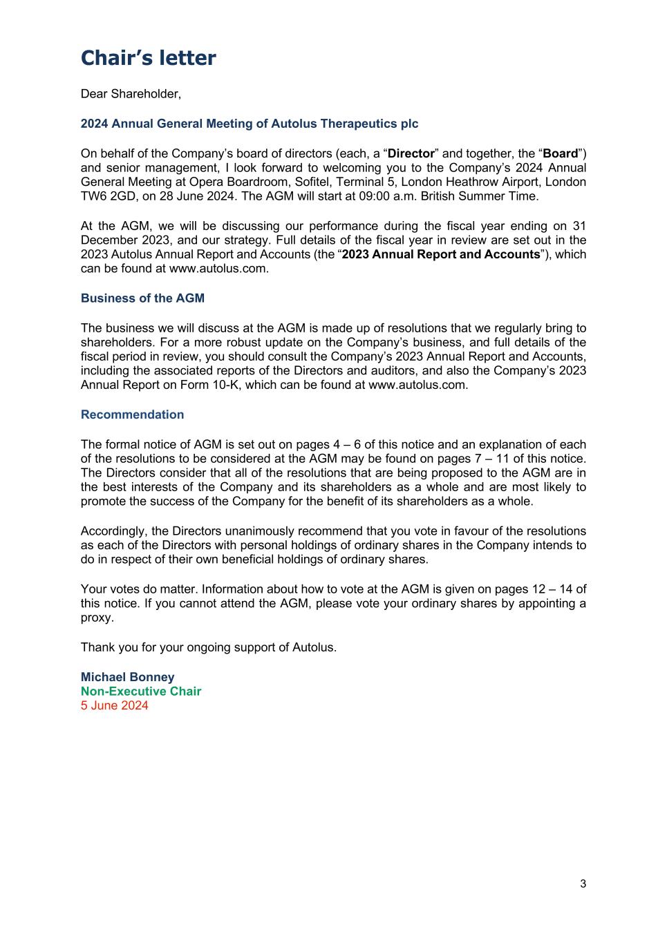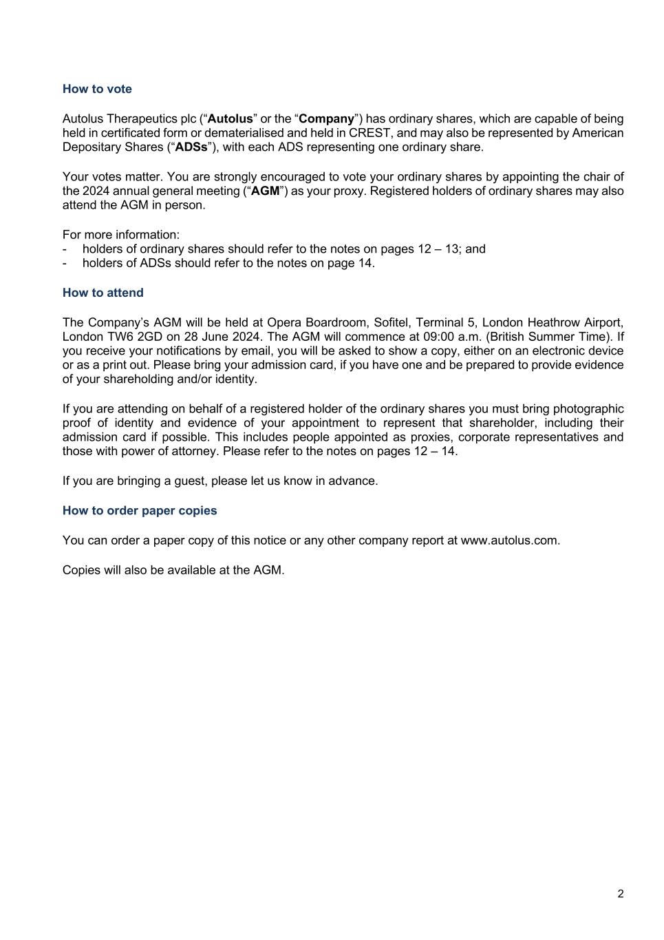 2 How to vote Autolus Therapeutics plc (“Autolus” or the “Company”) has ordinary shares, which are capable of being held in certificated form or dematerialised and held in CREST, and may also be represented by American Depositary Shares (“ADSs”), with each ADS representing one ordinary share. Your votes matter. You are strongly encouraged to vote your ordinary shares by appointing the chair of the 2024 annual general meeting (“AGM”) as your proxy. Registered holders of ordinary shares may also attend the AGM in person. For more information: - holders of ordinary shares should refer to the notes on pages 12 – 13; and - holders of ADSs should refer to the notes on page 14. How to attend The Company’s AGM will be held at Opera Boardroom, Sofitel, Terminal 5, London Heathrow Airport, London TW6 2GD on 28 June 2024. The AGM will commence at 09:00 a.m. (British Summer Time). If you receive your notifications by email, you will be asked to show a copy, either on an electronic device or as a print out. Please bring your admission card, if you have one and be prepared to provide evidence of your shareholding and/or identity. If you are attending on behalf of a registered holder of the ordinary shares you must bring photographic proof of identity and evidence of your appointment to represent that shareholder, including their admission card if possible. This includes people appointed as proxies, corporate representatives and those with power of attorney. Please refer to the notes on pages 12 – 14. If you are bringing a guest, please let us know in advance. How to order paper copies You can order a paper copy of this notice or any other company report at www.autolus.com. Copies will also be available at the AGM.