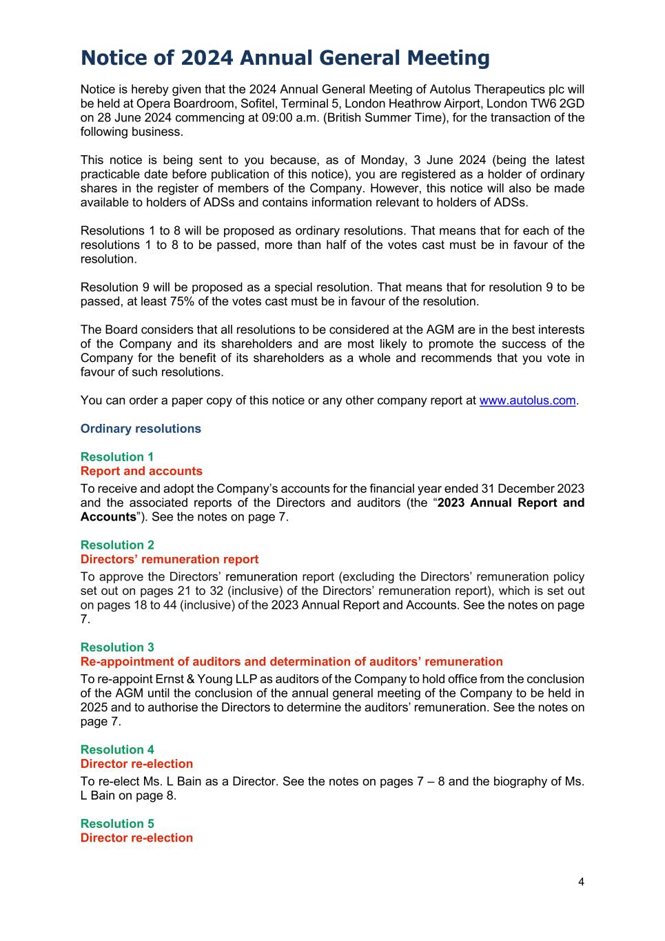 Notice of 2024 Annual General Meeting 4 Notice is hereby given that the 2024 Annual General Meeting of Autolus Therapeutics plc will be held at Opera Boardroom, Sofitel, Terminal 5, London Heathrow Airport, London TW6 2GD on 28 June 2024 commencing at 09:00 a.m. (British Summer Time), for the transaction of the following business. This notice is being sent to you because, as of Monday, 3 June 2024 (being the latest practicable date before publication of this notice), you are registered as a holder of ordinary shares in the register of members of the Company. However, this notice will also be made available to holders of ADSs and contains information relevant to holders of ADSs. Resolutions 1 to 8 will be proposed as ordinary resolutions. That means that for each of the resolutions 1 to 8 to be passed, more than half of the votes cast must be in favour of the resolution. Resolution 9 will be proposed as a special resolution. That means that for resolution 9 to be passed, at least 75% of the votes cast must be in favour of the resolution. The Board considers that all resolutions to be considered at the AGM are in the best interests of the Company and its shareholders and are most likely to promote the success of the Company for the benefit of its shareholders as a whole and recommends that you vote in favour of such resolutions. You can order a paper copy of this notice or any other company report at www.autolus.com. Ordinary resolutions Resolution 1 Report and accounts To receive and adopt the Company’s accounts for the financial year ended 31 December 2023 and the associated reports of the Directors and auditors (the “2023 Annual Report and Accounts”). See the notes on page 7. Resolution 2 Directors’ remuneration report To approve the Directors’ remuneration report (excluding the Directors’ remuneration policy set out on pages 21 to 32 (inclusive) of the Directors’ remuneration report), which is set out on pages 18 to 44 (inclusive) of the 2023 Annual Report and Accounts. See the notes on page 7. Resolution 3 Re-appointment of auditors and determination of auditors’ remuneration To re-appoint Ernst & Young LLP as auditors of the Company to hold office from the conclusion of the AGM until the conclusion of the annual general meeting of the Company to be held in 2025 and to authorise the Directors to determine the auditors’ remuneration. See the notes on page 7. Resolution 4 Director re-election To re-elect Ms. L Bain as a Director. See the notes on pages 7 – 8 and the biography of Ms. L Bain on page 8. Resolution 5 Director re-election