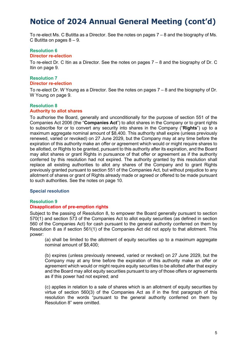 Notice of 2024 Annual General Meeting (cont’d) 5 To re-elect Ms. C Butitta as a Director. See the notes on pages 7 – 8 and the biography of Ms. C Butitta on pages 8 – 9. Resolution 6 Director re-election To re-elect Dr. C Itin as a Director. See the notes on pages 7 – 8 and the biography of Dr. C Itin on page 9. Resolution 7 Director re-election To re-elect Dr. W Young as a Director. See the notes on pages 7 – 8 and the biography of Dr. W Young on page 9. Resolution 8 Authority to allot shares To authorise the Board, generally and unconditionally for the purpose of section 551 of the Companies Act 2006 (the “Companies Act”) to allot shares in the Company or to grant rights to subscribe for or to convert any security into shares in the Company (“Rights”) up to a maximum aggregate nominal amount of $8,400. This authority shall expire (unless previously renewed, varied or revoked) on 27 June 2029, but the Company may at any time before the expiration of this authority make an offer or agreement which would or might require shares to be allotted, or Rights to be granted, pursuant to this authority after its expiration, and the Board may allot shares or grant Rights in pursuance of that offer or agreement as if the authority conferred by this resolution had not expired. The authority granted by this resolution shall replace all existing authorities to allot any shares of the Company and to grant Rights previously granted pursuant to section 551 of the Companies Act, but without prejudice to any allotment of shares or grant of Rights already made or agreed or offered to be made pursuant to such authorities. See the notes on page 10. Special resolution Resolution 9 Disapplication of pre-emption rights Subject to the passing of Resolution 8, to empower the Board generally pursuant to section 570(1) and section 573 of the Companies Act to allot equity securities (as defined in section 560 of the Companies Act) for cash pursuant to the general authority conferred on them by Resolution 8 as if section 561(1) of the Companies Act did not apply to that allotment. This power: (a) shall be limited to the allotment of equity securities up to a maximum aggregate nominal amount of $8,400; (b) expires (unless previously renewed, varied or revoked) on 27 June 2029, but the Company may at any time before the expiration of this authority make an offer or agreement which would or might require equity securities to be allotted after that expiry and the Board may allot equity securities pursuant to any of those offers or agreements as if this power had not expired; and (c) applies in relation to a sale of shares which is an allotment of equity securities by virtue of section 560(3) of the Companies Act as if in the first paragraph of this resolution the words “pursuant to the general authority conferred on them by Resolution 8” were omitted.