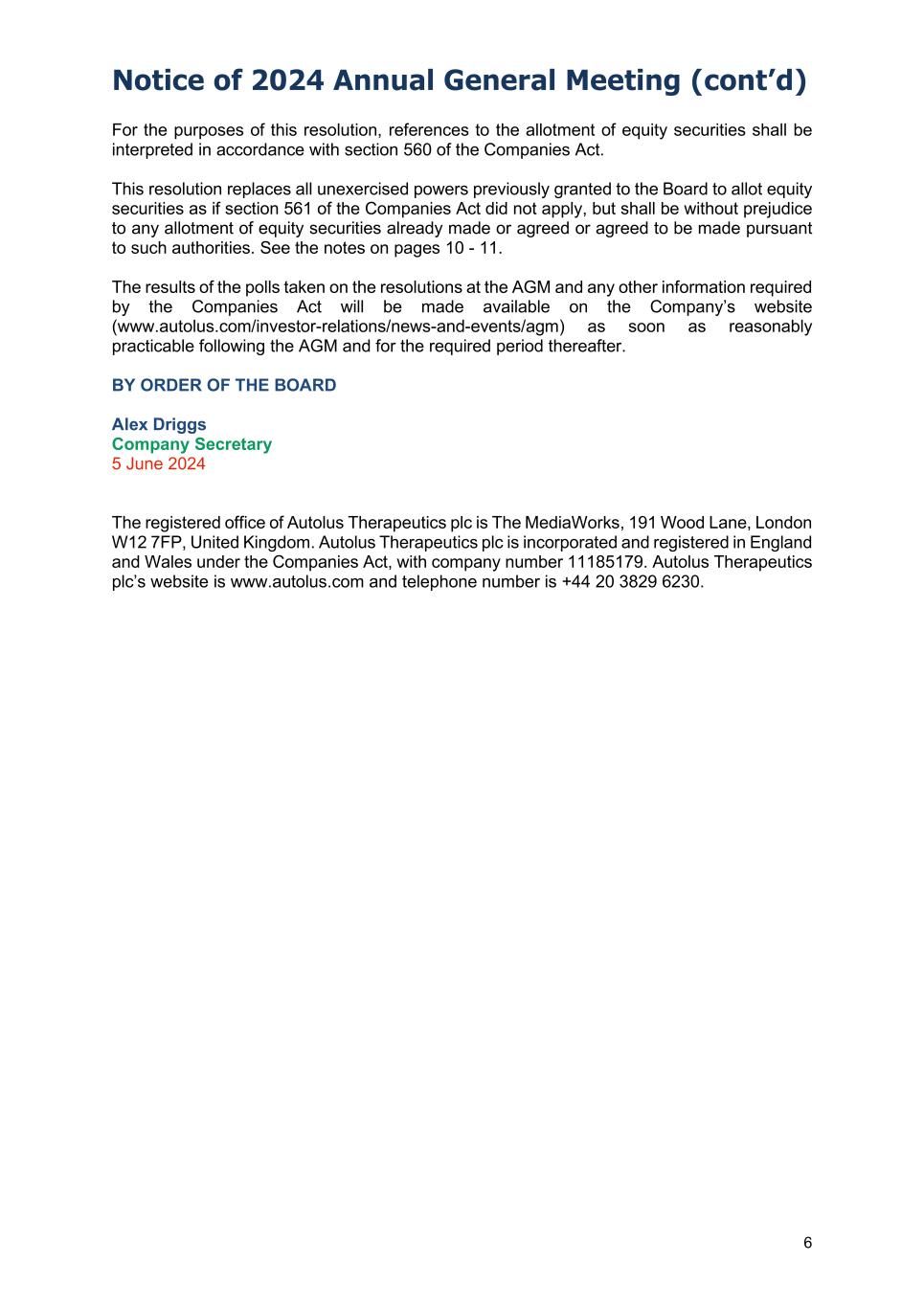 Notice of 2024 Annual General Meeting (cont’d) 6 For the purposes of this resolution, references to the allotment of equity securities shall be interpreted in accordance with section 560 of the Companies Act. This resolution replaces all unexercised powers previously granted to the Board to allot equity securities as if section 561 of the Companies Act did not apply, but shall be without prejudice to any allotment of equity securities already made or agreed or agreed to be made pursuant to such authorities. See the notes on pages 10 - 11. The results of the polls taken on the resolutions at the AGM and any other information required by the Companies Act will be made available on the Company’s website (www.autolus.com/investor-relations/news-and-events/agm) as soon as reasonably practicable following the AGM and for the required period thereafter. BY ORDER OF THE BOARD Alex Driggs Company Secretary 5 June 2024 The registered office of Autolus Therapeutics plc is The MediaWorks, 191 Wood Lane, London W12 7FP, United Kingdom. Autolus Therapeutics plc is incorporated and registered in England and Wales under the Companies Act, with company number 11185179. Autolus Therapeutics plc’s website is www.autolus.com and telephone number is +44 20 3829 6230.