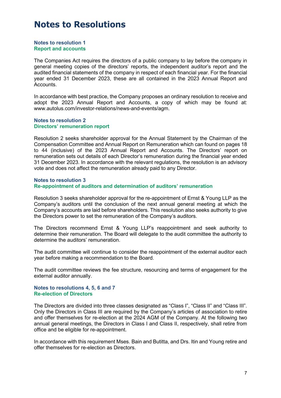 Notes to Resolutions 7 Notes to resolution 1 Report and accounts The Companies Act requires the directors of a public company to lay before the company in general meeting copies of the directors’ reports, the independent auditor’s report and the audited financial statements of the company in respect of each financial year. For the financial year ended 31 December 2023, these are all contained in the 2023 Annual Report and Accounts. In accordance with best practice, the Company proposes an ordinary resolution to receive and adopt the 2023 Annual Report and Accounts, a copy of which may be found at: www.autolus.com/investor-relations/news-and-events/agm. Notes to resolution 2 Directors’ remuneration report Resolution 2 seeks shareholder approval for the Annual Statement by the Chairman of the Compensation Committee and Annual Report on Remuneration which can found on pages 18 to 44 (inclusive) of the 2023 Annual Report and Accounts. The Directors’ report on remuneration sets out details of each Director’s remuneration during the financial year ended 31 December 2023. In accordance with the relevant regulations, the resolution is an advisory vote and does not affect the remuneration already paid to any Director. Notes to resolution 3 Re-appointment of auditors and determination of auditors’ remuneration Resolution 3 seeks shareholder approval for the re-appointment of Ernst & Young LLP as the Company’s auditors until the conclusion of the next annual general meeting at which the Company’s accounts are laid before shareholders. This resolution also seeks authority to give the Directors power to set the remuneration of the Company’s auditors. The Directors recommend Ernst & Young LLP’s reappointment and seek authority to determine their remuneration. The Board will delegate to the audit committee the authority to determine the auditors’ remuneration. The audit committee will continue to consider the reappointment of the external auditor each year before making a recommendation to the Board. The audit committee reviews the fee structure, resourcing and terms of engagement for the external auditor annually. Notes to resolutions 4, 5, 6 and 7 Re-election of Directors The Directors are divided into three classes designated as “Class I”, “Class II” and “Class III”. Only the Directors in Class III are required by the Company’s articles of association to retire and offer themselves for re-election at the 2024 AGM of the Company. At the following two annual general meetings, the Directors in Class I and Class II, respectively, shall retire from office and be eligible for re-appointment. In accordance with this requirement Mses. Bain and Butitta, and Drs. Itin and Young retire and offer themselves for re-election as Directors.
