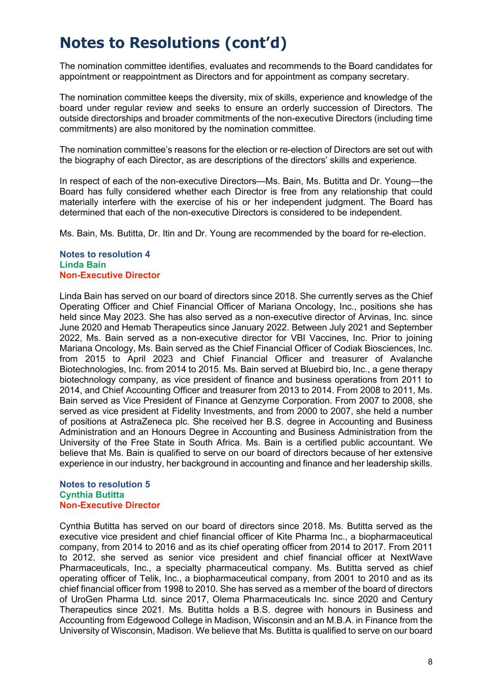 Notes to Resolutions (cont’d) 8 The nomination committee identifies, evaluates and recommends to the Board candidates for appointment or reappointment as Directors and for appointment as company secretary. The nomination committee keeps the diversity, mix of skills, experience and knowledge of the board under regular review and seeks to ensure an orderly succession of Directors. The outside directorships and broader commitments of the non-executive Directors (including time commitments) are also monitored by the nomination committee. The nomination committee’s reasons for the election or re-election of Directors are set out with the biography of each Director, as are descriptions of the directors’ skills and experience. In respect of each of the non-executive Directors—Ms. Bain, Ms. Butitta and Dr. Young—the Board has fully considered whether each Director is free from any relationship that could materially interfere with the exercise of his or her independent judgment. The Board has determined that each of the non-executive Directors is considered to be independent. Ms. Bain, Ms. Butitta, Dr. Itin and Dr. Young are recommended by the board for re-election. Notes to resolution 4 Linda Bain Non-Executive Director Linda Bain has served on our board of directors since 2018. She currently serves as the Chief Operating Officer and Chief Financial Officer of Mariana Oncology, Inc., positions she has held since May 2023. She has also served as a non-executive director of Arvinas, Inc. since June 2020 and Hemab Therapeutics since January 2022. Between July 2021 and September 2022, Ms. Bain served as a non-executive director for VBI Vaccines, Inc. Prior to joining Mariana Oncology, Ms. Bain served as the Chief Financial Officer of Codiak Biosciences, Inc. from 2015 to April 2023 and Chief Financial Officer and treasurer of Avalanche Biotechnologies, Inc. from 2014 to 2015. Ms. Bain served at Bluebird bio, Inc., a gene therapy biotechnology company, as vice president of finance and business operations from 2011 to 2014, and Chief Accounting Officer and treasurer from 2013 to 2014. From 2008 to 2011, Ms. Bain served as Vice President of Finance at Genzyme Corporation. From 2007 to 2008, she served as vice president at Fidelity Investments, and from 2000 to 2007, she held a number of positions at AstraZeneca plc. She received her B.S. degree in Accounting and Business Administration and an Honours Degree in Accounting and Business Administration from the University of the Free State in South Africa. Ms. Bain is a certified public accountant. We believe that Ms. Bain is qualified to serve on our board of directors because of her extensive experience in our industry, her background in accounting and finance and her leadership skills. Notes to resolution 5 Cynthia Butitta Non-Executive Director Cynthia Butitta has served on our board of directors since 2018. Ms. Butitta served as the executive vice president and chief financial officer of Kite Pharma Inc., a biopharmaceutical company, from 2014 to 2016 and as its chief operating officer from 2014 to 2017. From 2011 to 2012, she served as senior vice president and chief financial officer at NextWave Pharmaceuticals, Inc., a specialty pharmaceutical company. Ms. Butitta served as chief operating officer of Telik, Inc., a biopharmaceutical company, from 2001 to 2010 and as its chief financial officer from 1998 to 2010. She has served as a member of the board of directors of UroGen Pharma Ltd. since 2017, Olema Pharmaceuticals Inc. since 2020 and Century Therapeutics since 2021. Ms. Butitta holds a B.S. degree with honours in Business and Accounting from Edgewood College in Madison, Wisconsin and an M.B.A. in Finance from the University of Wisconsin, Madison. We believe that Ms. Butitta is qualified to serve on our board