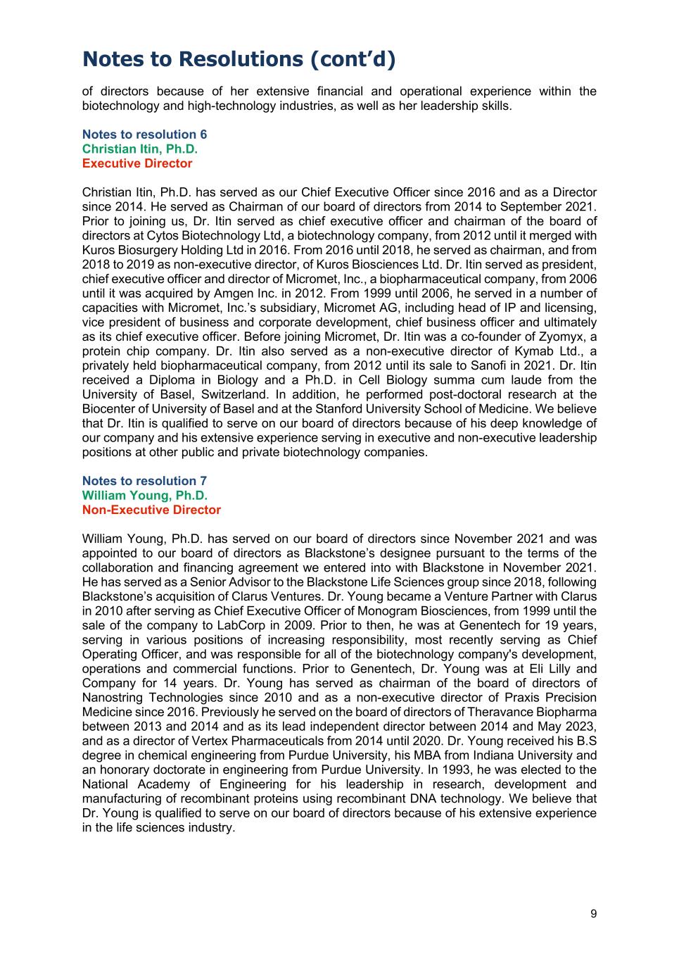 Notes to Resolutions (cont’d) 9 of directors because of her extensive financial and operational experience within the biotechnology and high-technology industries, as well as her leadership skills. Notes to resolution 6 Christian Itin, Ph.D. Executive Director Christian Itin, Ph.D. has served as our Chief Executive Officer since 2016 and as a Director since 2014. He served as Chairman of our board of directors from 2014 to September 2021. Prior to joining us, Dr. Itin served as chief executive officer and chairman of the board of directors at Cytos Biotechnology Ltd, a biotechnology company, from 2012 until it merged with Kuros Biosurgery Holding Ltd in 2016. From 2016 until 2018, he served as chairman, and from 2018 to 2019 as non-executive director, of Kuros Biosciences Ltd. Dr. Itin served as president, chief executive officer and director of Micromet, Inc., a biopharmaceutical company, from 2006 until it was acquired by Amgen Inc. in 2012. From 1999 until 2006, he served in a number of capacities with Micromet, Inc.’s subsidiary, Micromet AG, including head of IP and licensing, vice president of business and corporate development, chief business officer and ultimately as its chief executive officer. Before joining Micromet, Dr. Itin was a co-founder of Zyomyx, a protein chip company. Dr. Itin also served as a non-executive director of Kymab Ltd., a privately held biopharmaceutical company, from 2012 until its sale to Sanofi in 2021. Dr. Itin received a Diploma in Biology and a Ph.D. in Cell Biology summa cum laude from the University of Basel, Switzerland. In addition, he performed post-doctoral research at the Biocenter of University of Basel and at the Stanford University School of Medicine. We believe that Dr. Itin is qualified to serve on our board of directors because of his deep knowledge of our company and his extensive experience serving in executive and non-executive leadership positions at other public and private biotechnology companies. Notes to resolution 7 William Young, Ph.D. Non-Executive Director William Young, Ph.D. has served on our board of directors since November 2021 and was appointed to our board of directors as Blackstone’s designee pursuant to the terms of the collaboration and financing agreement we entered into with Blackstone in November 2021. He has served as a Senior Advisor to the Blackstone Life Sciences group since 2018, following Blackstone’s acquisition of Clarus Ventures. Dr. Young became a Venture Partner with Clarus in 2010 after serving as Chief Executive Officer of Monogram Biosciences, from 1999 until the sale of the company to LabCorp in 2009. Prior to then, he was at Genentech for 19 years, serving in various positions of increasing responsibility, most recently serving as Chief Operating Officer, and was responsible for all of the biotechnology company's development, operations and commercial functions. Prior to Genentech, Dr. Young was at Eli Lilly and Company for 14 years. Dr. Young has served as chairman of the board of directors of Nanostring Technologies since 2010 and as a non-executive director of Praxis Precision Medicine since 2016. Previously he served on the board of directors of Theravance Biopharma between 2013 and 2014 and as its lead independent director between 2014 and May 2023, and as a director of Vertex Pharmaceuticals from 2014 until 2020. Dr. Young received his B.S degree in chemical engineering from Purdue University, his MBA from Indiana University and an honorary doctorate in engineering from Purdue University. In 1993, he was elected to the National Academy of Engineering for his leadership in research, development and manufacturing of recombinant proteins using recombinant DNA technology. We believe that Dr. Young is qualified to serve on our board of directors because of his extensive experience in the life sciences industry.