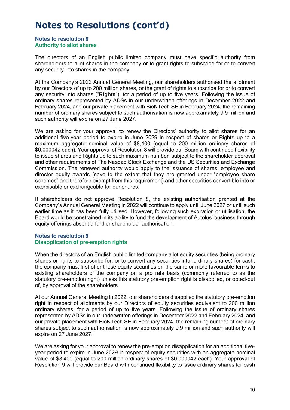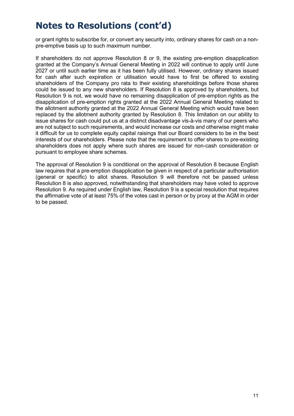 Notes to Resolutions (cont’d) 11 or grant rights to subscribe for, or convert any security into, ordinary shares for cash on a non- pre-emptive basis up to such maximum number. If shareholders do not approve Resolution 8 or 9, the existing pre-emption disapplication granted at the Company’s Annual General Meeting in 2022 will continue to apply until June 2027 or until such earlier time as it has been fully utilised. However, ordinary shares issued for cash after such expiration or utilisation would have to first be offered to existing shareholders of the Company pro rata to their existing shareholdings before those shares could be issued to any new shareholders. If Resolution 8 is approved by shareholders, but Resolution 9 is not, we would have no remaining disapplication of pre-emption rights as the disapplication of pre-emption rights granted at the 2022 Annual General Meeting related to the allotment authority granted at the 2022 Annual General Meeting which would have been replaced by the allotment authority granted by Resolution 8. This limitation on our ability to issue shares for cash could put us at a distinct disadvantage vis-à-vis many of our peers who are not subject to such requirements, and would increase our costs and otherwise might make it difficult for us to complete equity capital raisings that our Board considers to be in the best interests of our shareholders. Please note that the requirement to offer shares to pre-existing shareholders does not apply where such shares are issued for non-cash consideration or pursuant to employee share schemes. The approval of Resolution 9 is conditional on the approval of Resolution 8 because English law requires that a pre-emption disapplication be given in respect of a particular authorisation (general or specific) to allot shares. Resolution 9 will therefore not be passed unless Resolution 8 is also approved, notwithstanding that shareholders may have voted to approve Resolution 9. As required under English law, Resolution 9 is a special resolution that requires the affirmative vote of at least 75% of the votes cast in person or by proxy at the AGM in order to be passed.