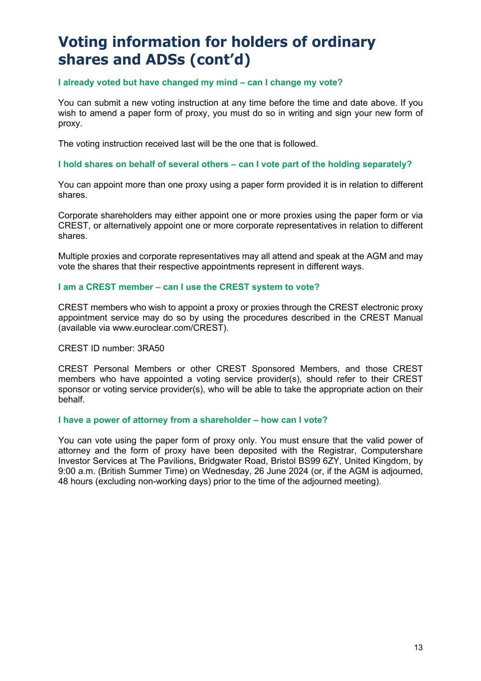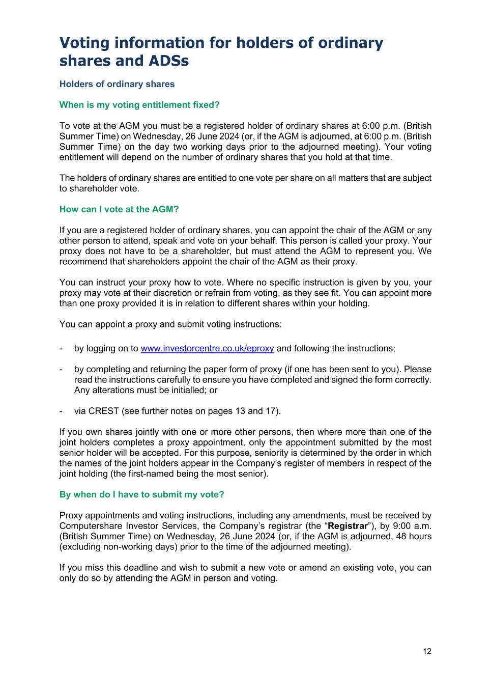 Voting information for holders of ordinary shares and ADSs 12 Holders of ordinary shares When is my voting entitlement fixed? To vote at the AGM you must be a registered holder of ordinary shares at 6:00 p.m. (British Summer Time) on Wednesday, 26 June 2024 (or, if the AGM is adjourned, at 6:00 p.m. (British Summer Time) on the day two working days prior to the adjourned meeting). Your voting entitlement will depend on the number of ordinary shares that you hold at that time. The holders of ordinary shares are entitled to one vote per share on all matters that are subject to shareholder vote. How can I vote at the AGM? If you are a registered holder of ordinary shares, you can appoint the chair of the AGM or any other person to attend, speak and vote on your behalf. This person is called your proxy. Your proxy does not have to be a shareholder, but must attend the AGM to represent you. We recommend that shareholders appoint the chair of the AGM as their proxy. You can instruct your proxy how to vote. Where no specific instruction is given by you, your proxy may vote at their discretion or refrain from voting, as they see fit. You can appoint more than one proxy provided it is in relation to different shares within your holding. You can appoint a proxy and submit voting instructions: - by logging on to www.investorcentre.co.uk/eproxy and following the instructions; - by completing and returning the paper form of proxy (if one has been sent to you). Please read the instructions carefully to ensure you have completed and signed the form correctly. Any alterations must be initialled; or - via CREST (see further notes on pages 13 and 17). If you own shares jointly with one or more other persons, then where more than one of the joint holders completes a proxy appointment, only the appointment submitted by the most senior holder will be accepted. For this purpose, seniority is determined by the order in which the names of the joint holders appear in the Company’s register of members in respect of the joint holding (the first-named being the most senior). By when do I have to submit my vote? Proxy appointments and voting instructions, including any amendments, must be received by Computershare Investor Services, the Company’s registrar (the “Registrar”), by 9:00 a.m. (British Summer Time) on Wednesday, 26 June 2024 (or, if the AGM is adjourned, 48 hours (excluding non-working days) prior to the time of the adjourned meeting). If you miss this deadline and wish to submit a new vote or amend an existing vote, you can only do so by attending the AGM in person and voting.