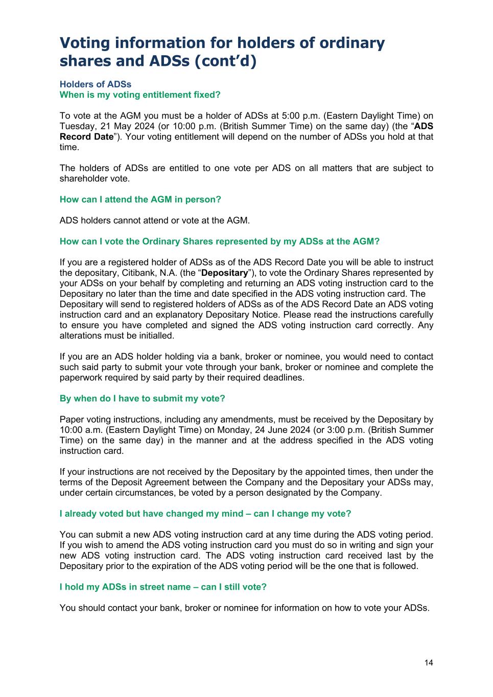 Voting information for holders of ordinary shares and ADSs (cont’d) 13 I already voted but have changed my mind – can I change my vote? You can submit a new voting instruction at any time before the time and date above. If you wish to amend a paper form of proxy, you must do so in writing and sign your new form of proxy. The voting instruction received last will be the one that is followed. I hold shares on behalf of several others – can I vote part of the holding separately? You can appoint more than one proxy using a paper form provided it is in relation to different shares. Corporate shareholders may either appoint one or more proxies using the paper form or via CREST, or alternatively appoint one or more corporate representatives in relation to different shares. Multiple proxies and corporate representatives may all attend and speak at the AGM and may vote the shares that their respective appointments represent in different ways. I am a CREST member – can I use the CREST system to vote? CREST members who wish to appoint a proxy or proxies through the CREST electronic proxy appointment service may do so by using the procedures described in the CREST Manual (available via www.euroclear.com/CREST). CREST ID number: 3RA50 CREST Personal Members or other CREST Sponsored Members, and those CREST members who have appointed a voting service provider(s), should refer to their CREST sponsor or voting service provider(s), who will be able to take the appropriate action on their behalf. I have a power of attorney from a shareholder – how can I vote? You can vote using the paper form of proxy only. You must ensure that the valid power of attorney and the form of proxy have been deposited with the Registrar, Computershare Investor Services at The Pavilions, Bridgwater Road, Bristol BS99 6ZY, United Kingdom, by 9:00 a.m. (British Summer Time) on Wednesday, 26 June 2024 (or, if the AGM is adjourned, 48 hours (excluding non-working days) prior to the time of the adjourned meeting).