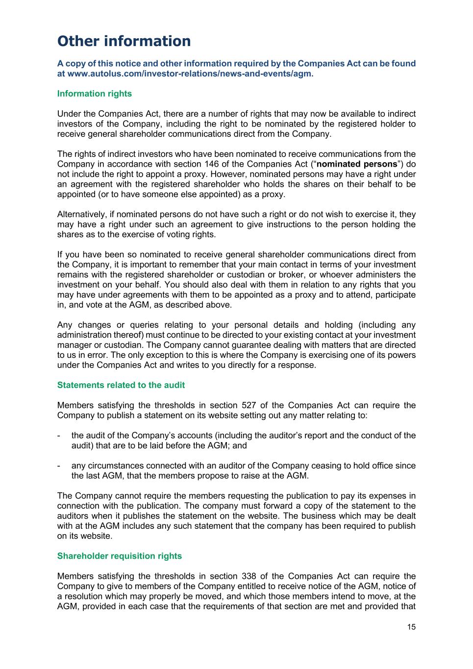 Other information 15 A copy of this notice and other information required by the Companies Act can be found at www.autolus.com/investor-relations/news-and-events/agm. Information rights Under the Companies Act, there are a number of rights that may now be available to indirect investors of the Company, including the right to be nominated by the registered holder to receive general shareholder communications direct from the Company. The rights of indirect investors who have been nominated to receive communications from the Company in accordance with section 146 of the Companies Act (“nominated persons”) do not include the right to appoint a proxy. However, nominated persons may have a right under an agreement with the registered shareholder who holds the shares on their behalf to be appointed (or to have someone else appointed) as a proxy. Alternatively, if nominated persons do not have such a right or do not wish to exercise it, they may have a right under such an agreement to give instructions to the person holding the shares as to the exercise of voting rights. If you have been so nominated to receive general shareholder communications direct from the Company, it is important to remember that your main contact in terms of your investment remains with the registered shareholder or custodian or broker, or whoever administers the investment on your behalf. You should also deal with them in relation to any rights that you may have under agreements with them to be appointed as a proxy and to attend, participate in, and vote at the AGM, as described above. Any changes or queries relating to your personal details and holding (including any administration thereof) must continue to be directed to your existing contact at your investment manager or custodian. The Company cannot guarantee dealing with matters that are directed to us in error. The only exception to this is where the Company is exercising one of its powers under the Companies Act and writes to you directly for a response. Statements related to the audit Members satisfying the thresholds in section 527 of the Companies Act can require the Company to publish a statement on its website setting out any matter relating to: - the audit of the Company’s accounts (including the auditor’s report and the conduct of the audit) that are to be laid before the AGM; and - any circumstances connected with an auditor of the Company ceasing to hold office since the last AGM, that the members propose to raise at the AGM. The Company cannot require the members requesting the publication to pay its expenses in connection with the publication. The company must forward a copy of the statement to the auditors when it publishes the statement on the website. The business which may be dealt with at the AGM includes any such statement that the company has been required to publish on its website. Shareholder requisition rights Members satisfying the thresholds in section 338 of the Companies Act can require the Company to give to members of the Company entitled to receive notice of the AGM, notice of a resolution which may properly be moved, and which those members intend to move, at the AGM, provided in each case that the requirements of that section are met and provided that