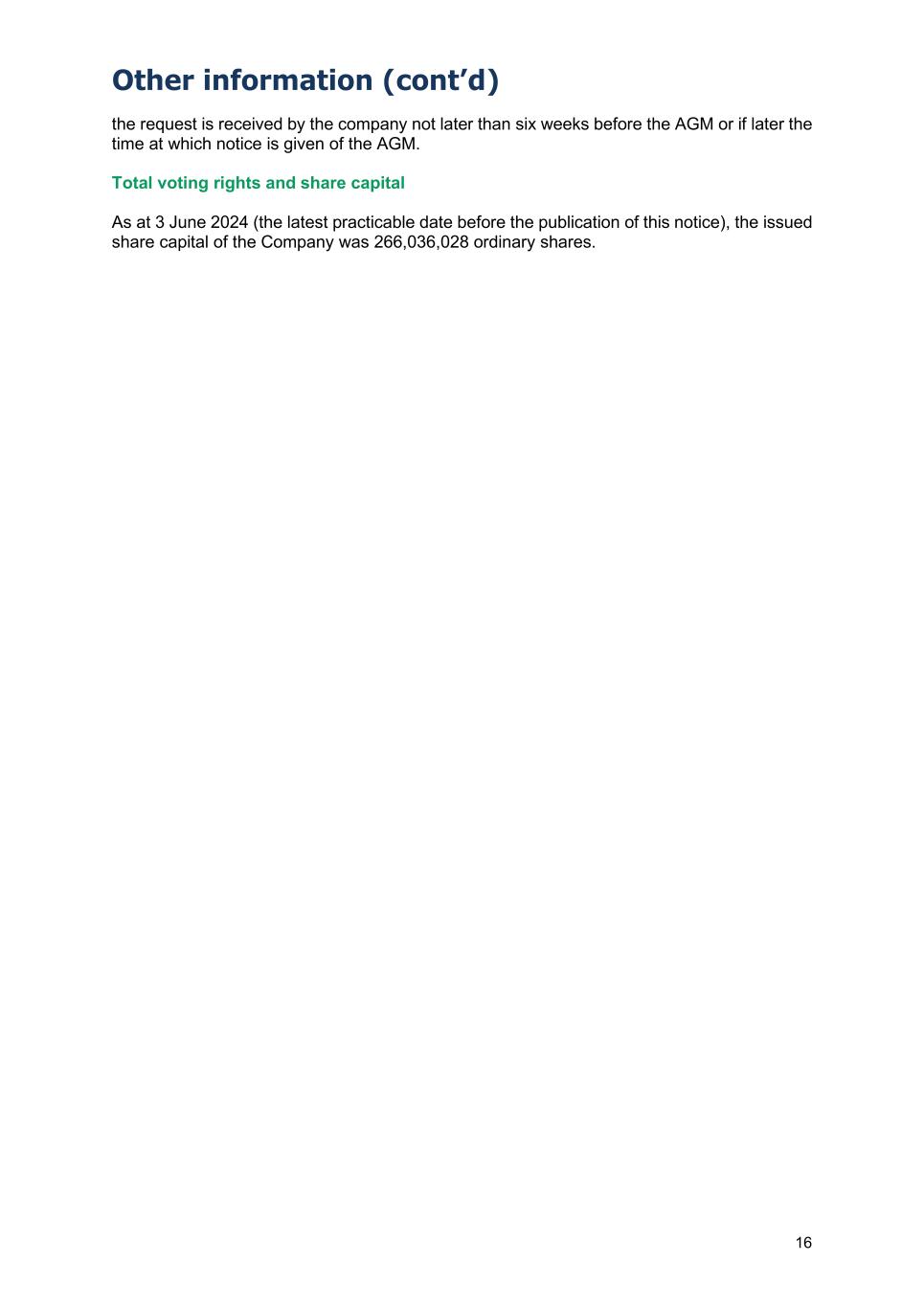 Other information (cont’d) 16 the request is received by the company not later than six weeks before the AGM or if later the time at which notice is given of the AGM. Total voting rights and share capital As at 3 June 2024 (the latest practicable date before the publication of this notice), the issued share capital of the Company was 266,036,028 ordinary shares.
