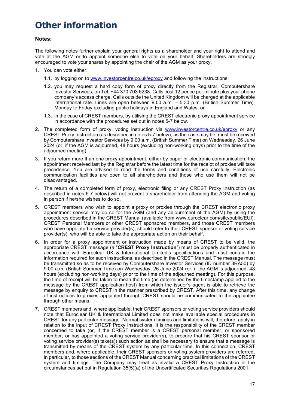 Other information 17 Notes: The following notes further explain your general rights as a shareholder and your right to attend and vote at the AGM or to appoint someone else to vote on your behalf. Shareholders are strongly encouraged to vote your shares by appointing the chair of the AGM as your proxy. 1. You can vote either: 1.1. by logging on to www.investorcentre.co.uk/eproxy and following the instructions; 1.2. you may request a hard copy form of proxy directly from the Registrar, Computershare Investor Services, on Tel: +44 370 703 6238. Calls cost 12 pence per minute plus your phone company’s access charge. Calls outside the United Kingdom will be charged at the applicable international rate. Lines are open between 9:00 a.m. – 5:30 p.m. (British Summer Time), Monday to Friday excluding public holidays in England and Wales; or 1.3. in the case of CREST members, by utilising the CREST electronic proxy appointment service in accordance with the procedures set out in notes 5-7 below. 2. The completed form of proxy, voting instruction via www.investorcentre.co.uk/eproxy or any CREST Proxy Instruction (as described in notes 5-7 below), as the case may be, must be received by Computershare Investor Services by 9:00 a.m. (British Summer Time) on Wednesday, 26 June 2024 (or, if the AGM is adjourned, 48 hours (excluding non-working days) prior to the time of the adjourned meeting). 3. If you return more than one proxy appointment, either by paper or electronic communication, the appointment received last by the Registrar before the latest time for the receipt of proxies will take precedence. You are advised to read the terms and conditions of use carefully. Electronic communication facilities are open to all shareholders and those who use them will not be disadvantaged. 4. The return of a completed form of proxy, electronic filing or any CREST Proxy Instruction (as described in notes 5-7 below) will not prevent a shareholder from attending the AGM and voting in person if he/she wishes to do so. 5. CREST members who wish to appoint a proxy or proxies through the CREST electronic proxy appointment service may do so for the AGM (and any adjournment of the AGM) by using the procedures described in the CREST Manual (available from www.euroclear.com/site/public/EUI). CREST Personal Members or other CREST sponsored members, and those CREST members who have appointed a service provider(s), should refer to their CREST sponsor or voting service provider(s), who will be able to take the appropriate action on their behalf. 6. In order for a proxy appointment or instruction made by means of CREST to be valid, the appropriate CREST message (a “CREST Proxy Instruction”) must be properly authenticated in accordance with Euroclear UK & International Limited’s specifications and must contain the information required for such instructions, as described in the CREST Manual. The message must be transmitted so as to be received by Computershare Investor Services (ID number 3RA50) by 9:00 a.m. (British Summer Time) on Wednesday, 26 June 2024 (or, if the AGM is adjourned, 48 hours (excluding non-working days) prior to the time of the adjourned meeting). For this purpose, the time of receipt will be taken to mean the time (as determined by the timestamp applied to the message by the CREST application host) from which the issuer’s agent is able to retrieve the message by enquiry to CREST in the manner prescribed by CREST. After this time, any change of instructions to proxies appointed through CREST should be communicated to the appointee through other means. 7. CREST members and, where applicable, their CREST sponsors or voting service providers should note that Euroclear UK & International Limited does not make available special procedures in CREST for any particular message. Normal system timings and limitations will, therefore, apply in relation to the input of CREST Proxy Instructions. It is the responsibility of the CREST member concerned to take (or, if the CREST member is a CREST personal member, or sponsored member, or has appointed a voting service provider(s), to procure that his CREST sponsor or voting service provider(s) take(s)) such action as shall be necessary to ensure that a message is transmitted by means of the CREST system by any particular time. In this connection, CREST members and, where applicable, their CREST sponsors or voting system providers are referred, in particular, to those sections of the CREST Manual concerning practical limitations of the CREST system and timings. The Company may treat as invalid a CREST Proxy Instruction in the circumstances set out in Regulation 35(5)(a) of the Uncertificated Securities Regulations 2001.