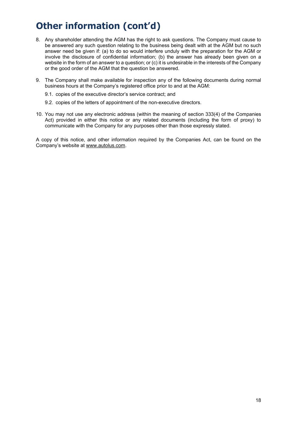 Other information (cont’d) 18 8. Any shareholder attending the AGM has the right to ask questions. The Company must cause to be answered any such question relating to the business being dealt with at the AGM but no such answer need be given if: (a) to do so would interfere unduly with the preparation for the AGM or involve the disclosure of confidential information; (b) the answer has already been given on a website in the form of an answer to a question; or (c) it is undesirable in the interests of the Company or the good order of the AGM that the question be answered. 9. The Company shall make available for inspection any of the following documents during normal business hours at the Company’s registered office prior to and at the AGM: 9.1. copies of the executive director’s service contract; and 9.2. copies of the letters of appointment of the non-executive directors. 10. You may not use any electronic address (within the meaning of section 333(4) of the Companies Act) provided in either this notice or any related documents (including the form of proxy) to communicate with the Company for any purposes other than those expressly stated. A copy of this notice, and other information required by the Companies Act, can be found on the Company’s website at www.autolus.com.
