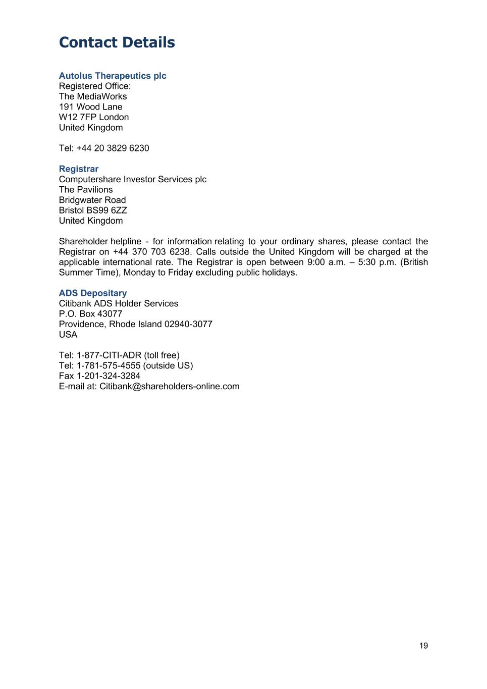 Contact Details 19 Autolus Therapeutics plc Registered Office: The MediaWorks 191 Wood Lane W12 7FP London United Kingdom Tel: +44 20 3829 6230 Registrar Computershare Investor Services plc The Pavilions Bridgwater Road Bristol BS99 6ZZ United Kingdom Shareholder helpline - for information relating to your ordinary shares, please contact the Registrar on +44 370 703 6238. Calls outside the United Kingdom will be charged at the applicable international rate. The Registrar is open between 9:00 a.m. – 5:30 p.m. (British Summer Time), Monday to Friday excluding public holidays. ADS Depositary Citibank ADS Holder Services P.O. Box 43077 Providence, Rhode Island 02940-3077 USA Tel: 1-877-CITI-ADR (toll free) Tel: 1-781-575-4555 (outside US) Fax 1-201-324-3284 E-mail at: Citibank@shareholders-online.com