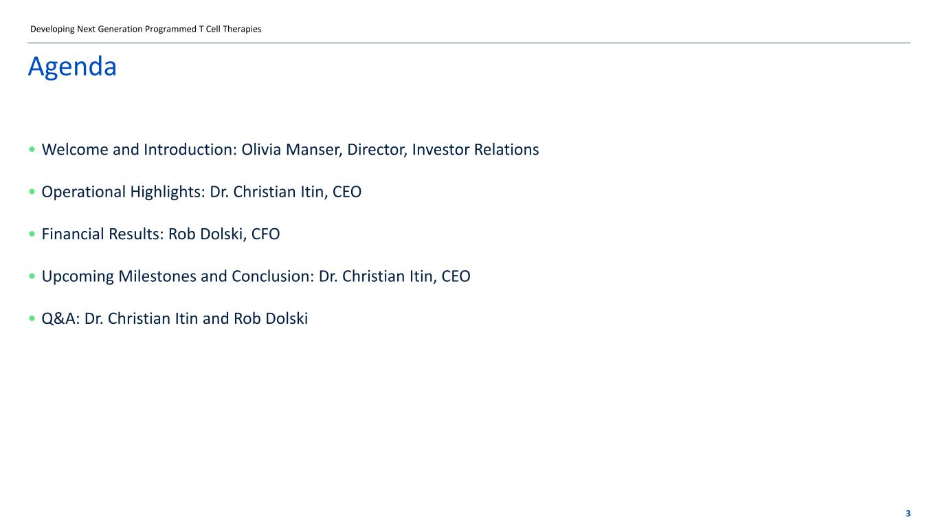 Agenda 3 Developing Next Generation Programmed T Cell Therapies • Welcome and Introduction: Olivia Manser, Director, Investor Relations • Operational Highlights: Dr. Christian Itin, CEO • Financial Results: Rob Dolski, CFO • Upcoming Milestones and Conclusion: Dr. Christian Itin, CEO • Q&A: Dr. Christian Itin and Rob Dolski