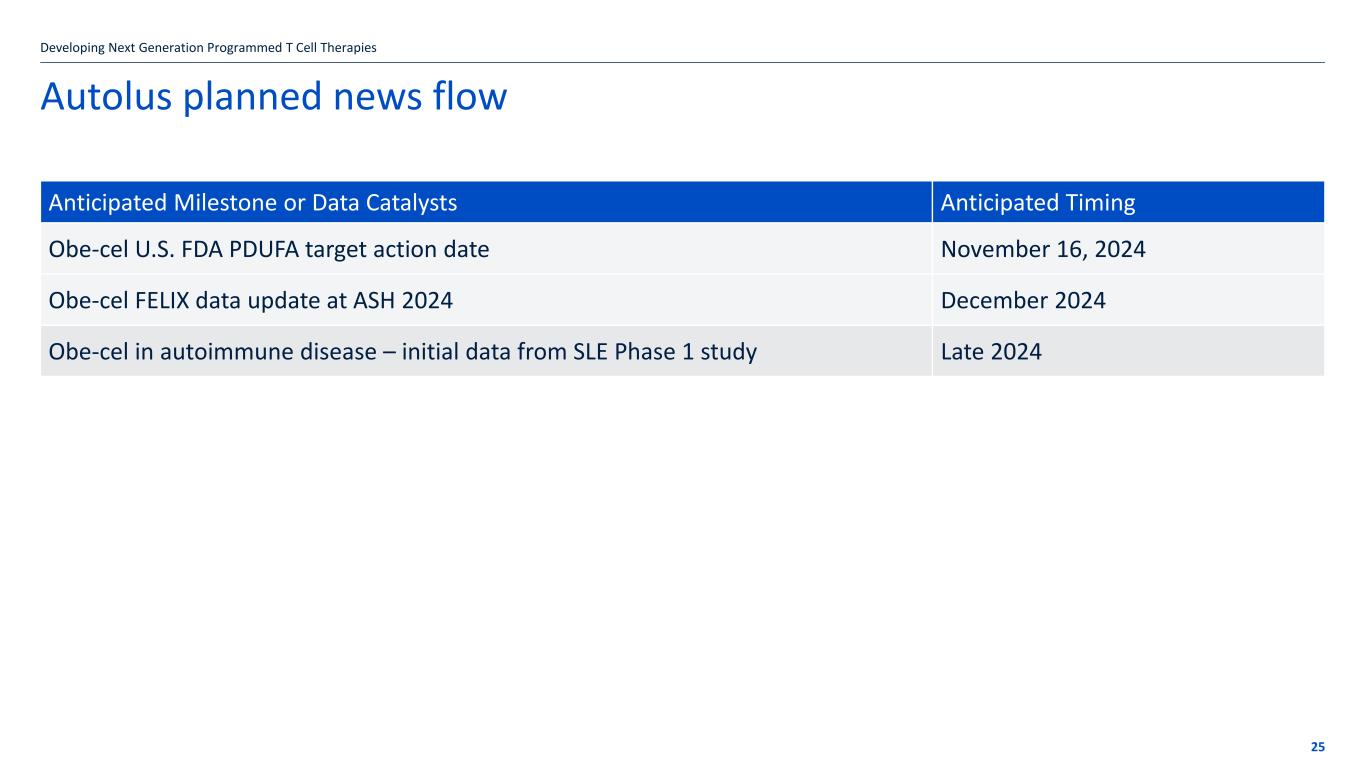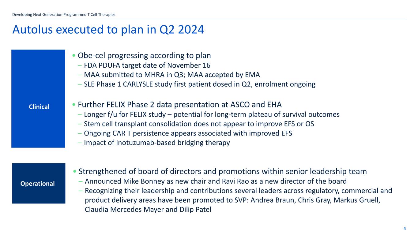 Disclaimer These slides contain forward-looking statements within the meaning of the “safe harbor” provisions of the Private Securities Litigation Reform Act of 1995. Forward-looking statements are statements that are not historical facts, and in some cases can be identified by terms such as “may,” “will,” “could,” “expects,” “plans,” “anticipates,” and “believes.” These statements include, but are not limited to, statements regarding Autolus’ development of its product candidates, including the obe-cel program; the profile and potential application of obe- cel in additional disease settings; the future clinical development, efficacy, safety and therapeutic potential of the Company’s product candidates, including progress, expectations as to the reporting of data, conduct and timing and potential future clinical and preclinical activity and milestones; expectations regarding the initiation, design and reporting of data from clinical trials and preclinical studies; the extension of the pipeline beyond obe-cel; expectations regarding the regulatory approval process for any product candidates; the benefits of the collaboration between Autolus and BioNTech, including the potential and timing of milestone payments and royalties under the terms of the strategic collaboration; the Company’s current and future manufacturing capabilities; and the Company’s anticipated cash runway. Any forward-looking statements are based on management’s current views and assumptions and involve risks and uncertainties that could cause actual results, performance, or events to differ materially from those expressed or implied in such statements. These risks and uncertainties include, but are not limited to, the risks that Autolus’ preclinical or clinical programs do not advance or result in approved products on a timely or cost effective basis or at all; the results of early clinical trials are not always being predictive of future results; the cost, timing and results of clinical trials; that many product candidates do not become approved drugs on a timely or cost effective basis or at all; the ability to enroll patients in clinical trials; and possible safety and efficacy concerns. For a discussion of other risks and uncertainties, and other important factors, any of which could cause Autolus’ actual results to differ from those contained in the forward-looking statements, see the section titled “Risk Factors” in Autolus' Annual Report on Form 10-K filed with the Securities and Exchange Commission, or the SEC, on March 21, 2024, as well as discussions of potential risks, uncertainties, and other important factors in Autolus’ subsequent filings with the Securities and Exchange Commission. All information in this presentation is as of the date of the presentation, and Autolus undertakes no obligation to publicly update any forward-looking statement, whether as a result of new information, future events, or otherwise, except as required by law. You should, therefore, not rely on these forward-looking statements as representing the Company’s views as of any date subsequent to the date of this presentation. Developing Next Generation Programmed T Cell Therapies 2