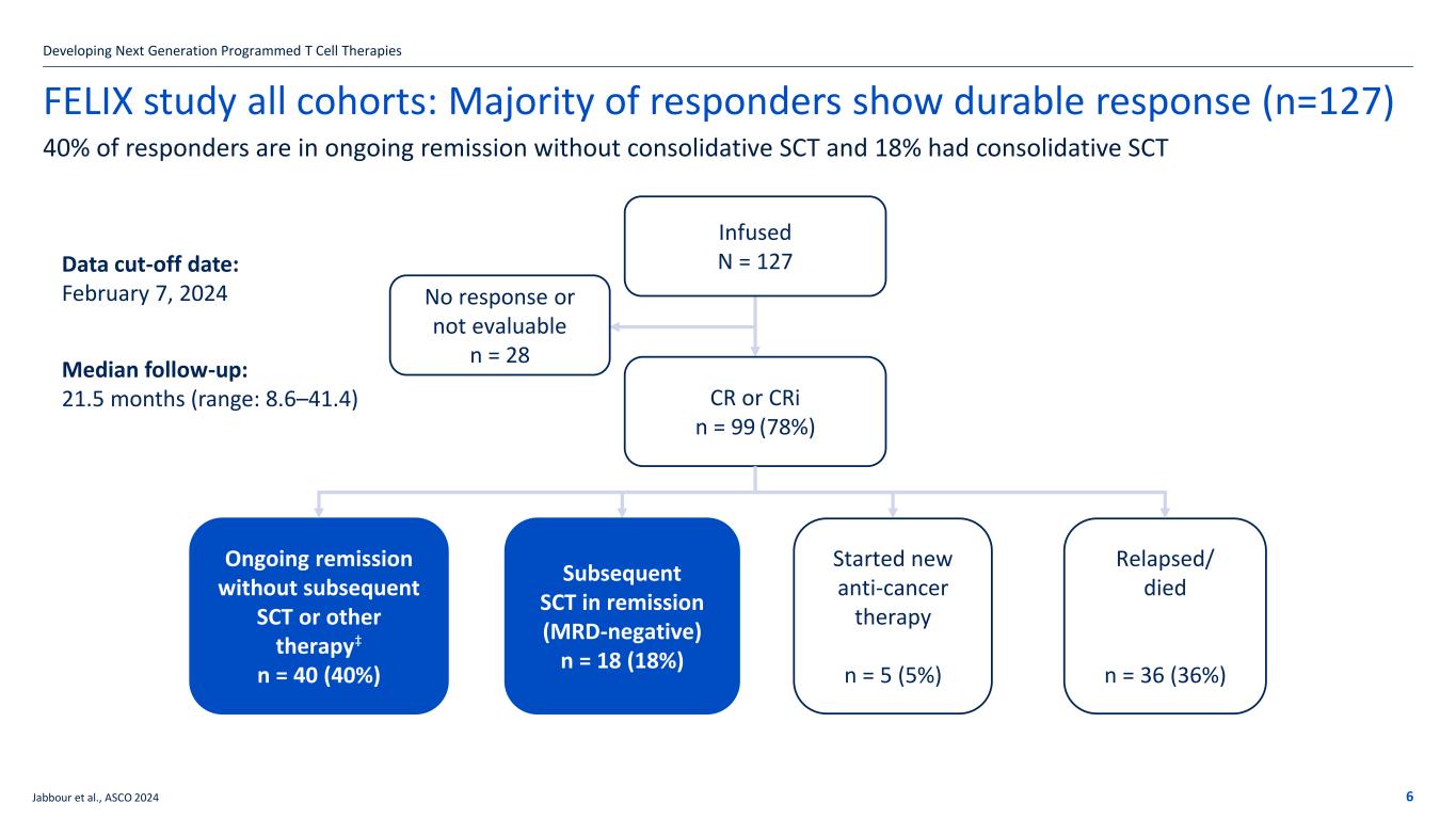 FELIX study all cohorts: Event-free survival (n=127) Developing Next Generation Programmed T Cell Therapies 7 Subset of patients benefit from standalone treatment with obe-cel 44.0 (35.2, 52.5) 127 12231017263647637991 Without censoring for SCT Without censoring for SCT 9.0 (6.57, 14.32) P ro b ab ili ty ( % ) 90 80 70 60 50 40 30 20 10 100 0 Time (months)Patients at risk 12-month EFS rate (95% CI), %: Censoring for SCT (main analysis) 0 363534333231302928272625242322212019181716151413121110987654321 37 127 2315285385 129233865 Censoring for SCT 49.5 (39.6, 58.6) Median (95% CI), months: 11.9 (7.98, 22.11) • All (18/18) patients who had SCT in remission were MRD-negative • 10/18 patients (55.6%) had ongoing CAR T persistence prior to SCT (n = 2 ongoing without event; n = 8 relapse or death) • Characteristics similar between patients who did and did not undergo consolidative SCT Jabbour et al., ASCO 2024