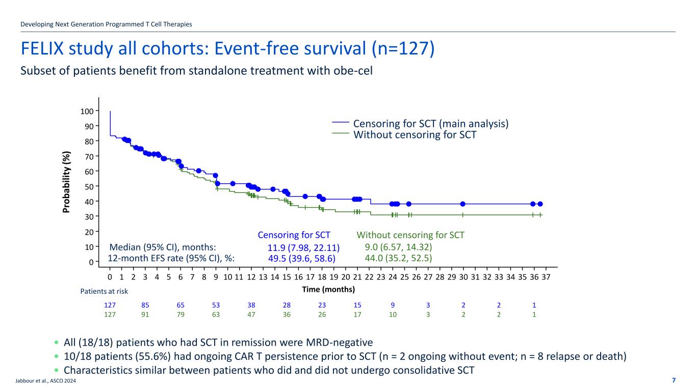 FELIX study all cohorts: Majority of responders show durable response (n=127) Developing Next Generation Programmed T Cell Therapies 6 40% of responders are in ongoing remission without consolidative SCT and 18% had consolidative SCT CR or CRi n = 99 (78%) Infused N = 127 Started new anti-cancer therapy n = 5 (5%) Subsequent SCT in remission (MRD-negative) n = 18 (18%) Ongoing remission without subsequent SCT or other therapy‡ n = 40 (40%) No response or not evaluable n = 28 Relapsed/ died n = 36 (36%) Data cut-off date: February 7, 2024 Median follow-up: 21.5 months (range: 8.6–41.4) Jabbour et al., ASCO 2024