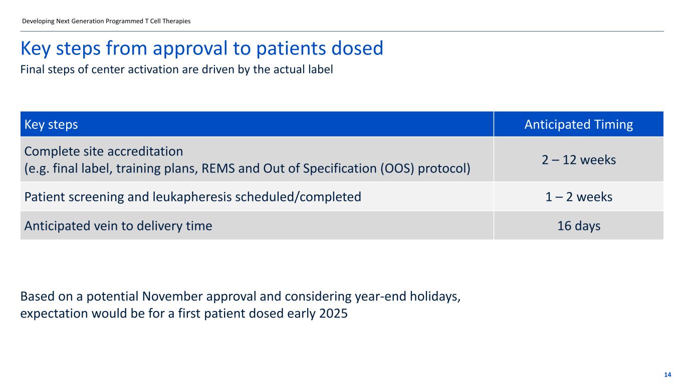 2024 2025 Now-Oct Nov Dec Jan Feb Mar US treatment center timelines for authorization and first patient readiness Centers have their own internal processes / requirements to fulfil prior to administering CAR T; therefore, not every center will be ready to prescribe upon receiving Autolus authorization Qualification (activities ongoing) Activation Activities Complete = Authorization Activation Trigger PDUFA* (Nov 16th) Autolus Authorization Example Center-defined Activities (varies by center) 1. Conduct final trainings based on FDA approved label 2. Administer Risk Evaluation & Mitigation Strategy training ✓ Center Electronic Health Records order sets for obe-cel ✓ Pharmacy & Therapeutics Committee review ✓ Value assessment ✓ Financial clearance finalized ✓ External center authorization document ✓ Addition to Authorized Treatment Center locator *FDA=US Food and Drug Administration; PDUFA=Prescription Drug User Fee Act Developing Next Generation Programmed T Cell Therapies 13