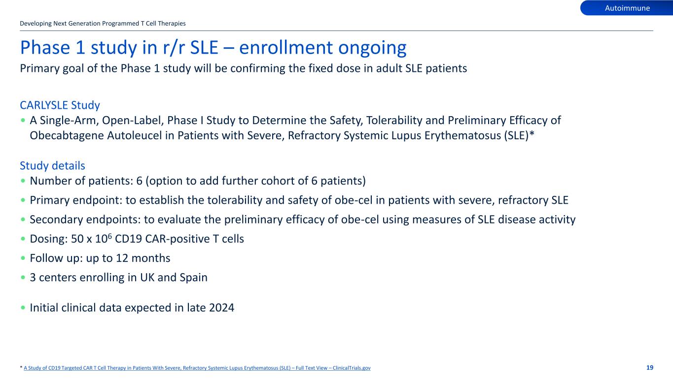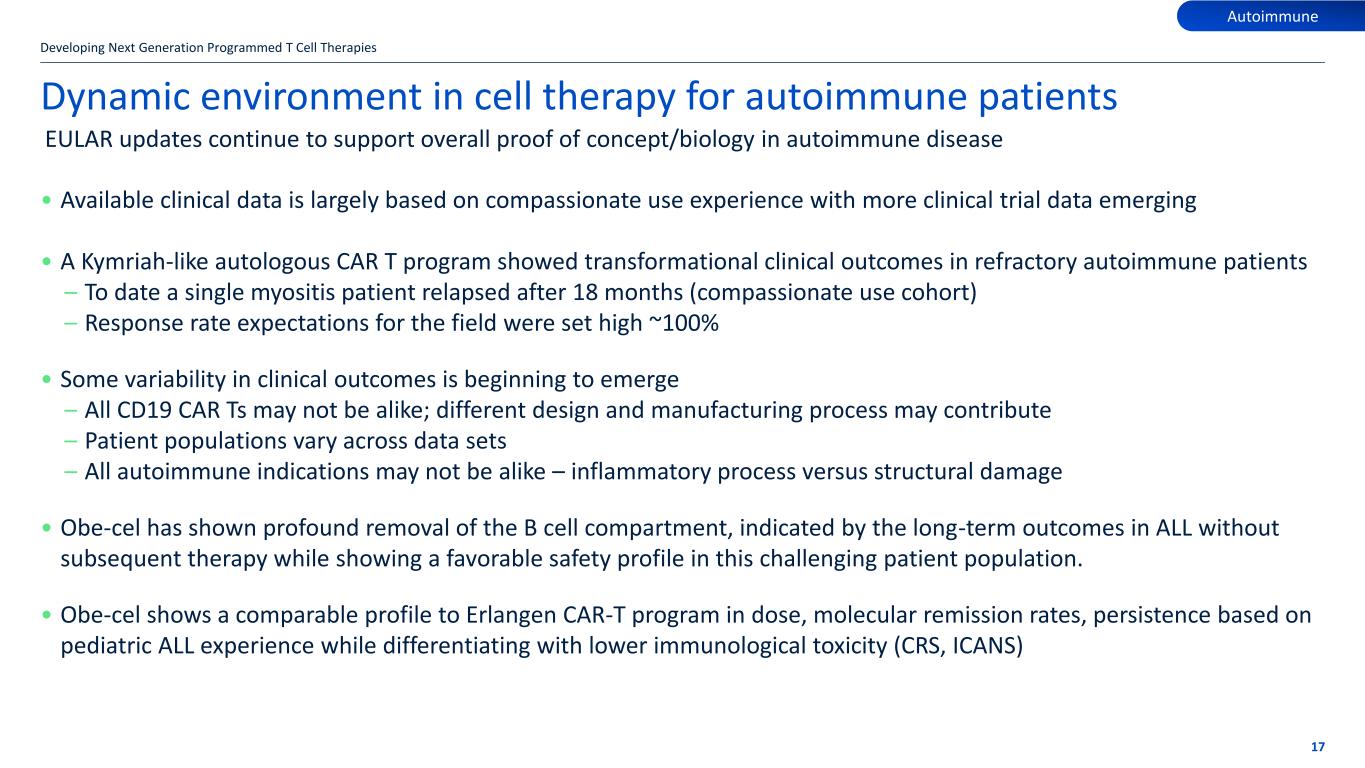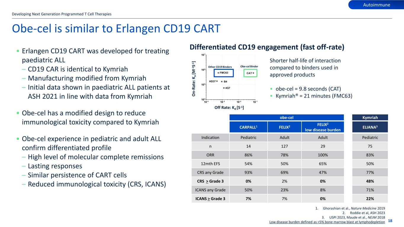 Dynamic environment in cell therapy for autoimmune patients Developing Next Generation Programmed T Cell Therapies 17 EULAR updates continue to support overall proof of concept/biology in autoimmune disease • Available clinical data is largely based on compassionate use experience with more clinical trial data emerging • A Kymriah-like autologous CAR T program showed transformational clinical outcomes in refractory autoimmune patients – To date a single myositis patient relapsed after 18 months (compassionate use cohort) – Response rate expectations for the field were set high ~100% • Some variability in clinical outcomes is beginning to emerge – All CD19 CAR Ts may not be alike; different design and manufacturing process may contribute – Patient populations vary across data sets – All autoimmune indications may not be alike – inflammatory process versus structural damage • Obe-cel has shown profound removal of the B cell compartment, indicated by the long-term outcomes in ALL without subsequent therapy while showing a favorable safety profile in this challenging patient population. • Obe-cel shows a comparable profile to Erlangen CAR-T program in dose, molecular remission rates, persistence based on pediatric ALL experience while differentiating with lower immunological toxicity (CRS, ICANS) Autoimmune