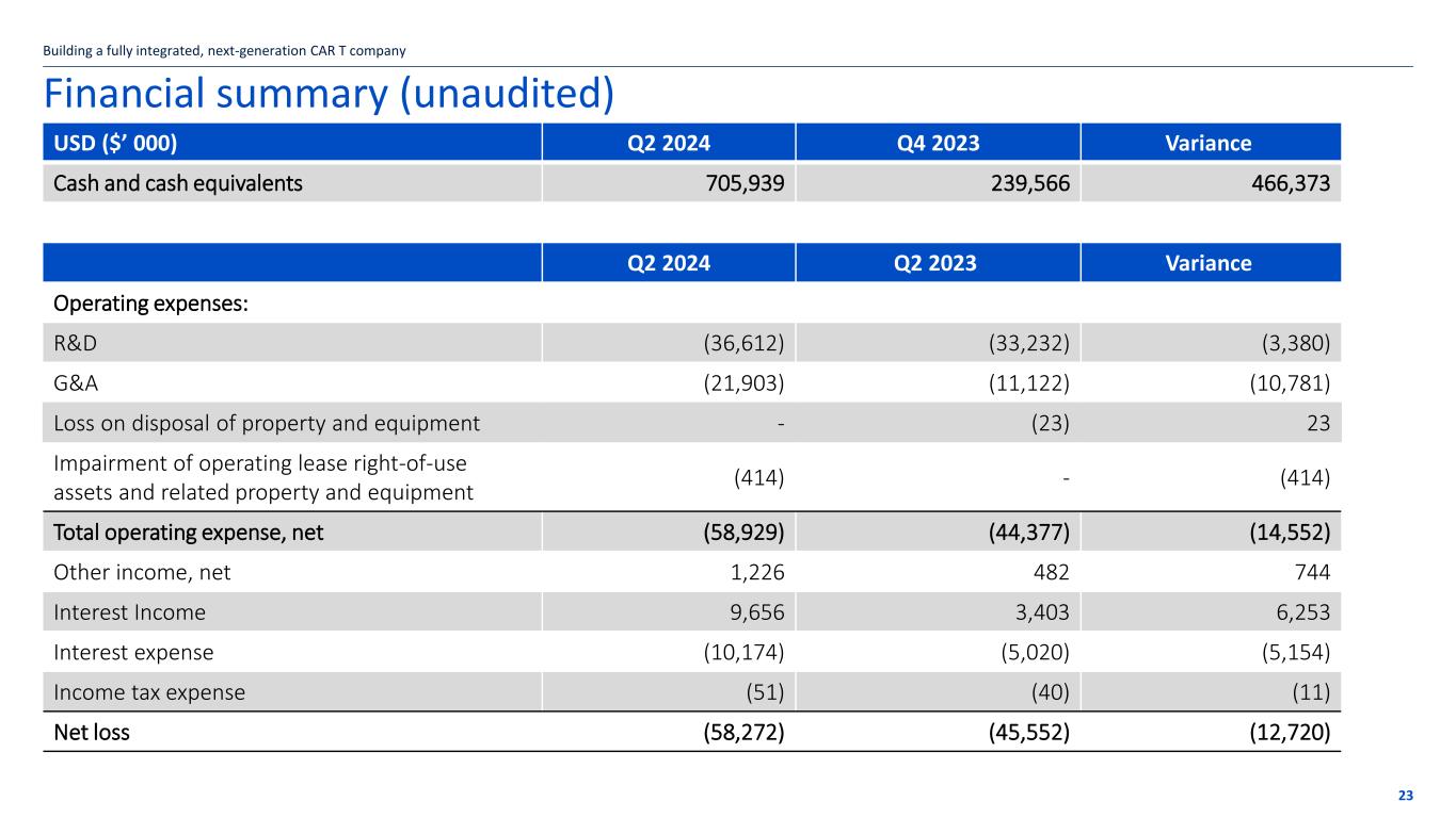 Financial summary (unaudited) USD ($’ 000) Q2 2024 Q4 2023 Variance Cash and cash equivalents 705,939 239,566 466,373 Q2 2024 Q2 2023 Variance Operating expenses: R&D (36,612) (33,232) (3,380) G&A (21,903) (11,122) (10,781) Loss on disposal of property and equipment - (23) 23 Impairment of operating lease right-of-use assets and related property and equipment (414) - (414) Total operating expense, net (58,929) (44,377) (14,552) Other income, net 1,226 482 744 Interest Income 9,656 3,403 6,253 Interest expense (10,174) (5,020) (5,154) Income tax expense (51) (40) (11) Net loss (58,272) (45,552) (12,720) Building a fully integrated, next-generation CAR T company 23
