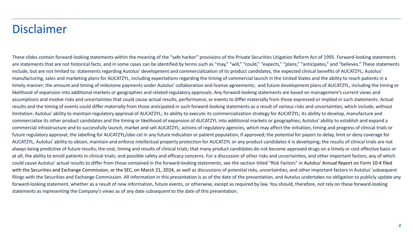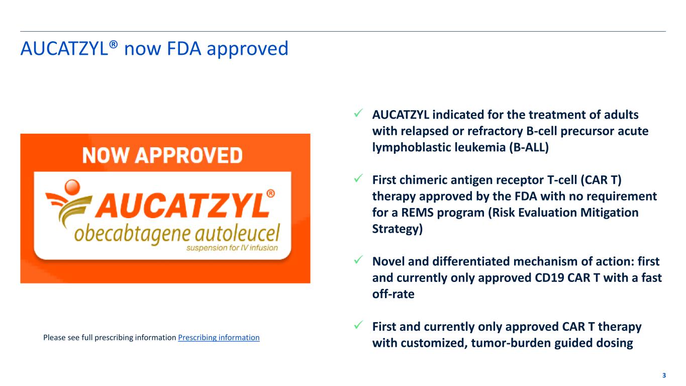 Disclaimer These slides contain forward-looking statements within the meaning of the “safe harbor” provisions of the Private Securities Litigation Reform Act of 1995. Forward-looking statements are statements that are not historical facts, and in some cases can be identified by terms such as “may,” “will,” “could,” “expects,” “plans,” “anticipates,” and “believes.” These statements include, but are not limited to: statements regarding Autolus’ development and commercialization of its product candidates, the expected clinical benefits of AUCATZYL; Autolus' manufacturing, sales and marketing plans for AUCATZYL, including expectations regarding the timing of commercial launch in the United States and the ability to reach patients in a timely manner; the amount and timing of milestone payments under Autolus' collaboration and license agreements; and future development plans of AUCATZYL, including the timing or likelihood of expansion into additional markets or geographies and related regulatory approvals. Any forward-looking statements are based on management’s current views and assumptions and involve risks and uncertainties that could cause actual results, performance, or events to differ materially from those expressed or implied in such statements. Actual results and the timing of events could differ materially from those anticipated in such forward-looking statements as a result of various risks and uncertainties, which include, without limitation: Autolus' ability to maintain regulatory approval of AUCATZYL; its ability to execute its commercialization strategy for AUCATZYL; its ability to develop, manufacture and commercialize its other product candidates and the timing or likelihood of expansion of AUCATZYL into additional markets or geographies; Autolus' ability to establish and expand a commercial infrastructure and to successfully launch, market and sell AUCATZYL; actions of regulatory agencies, which may affect the initiation, timing and progress of clinical trials or future regulatory approval; the labelling for AUCATZYL/obe-cel in any future indication or patient population, if approved; the potential for payors to delay, limit or deny coverage for AUCATZYL; Autolus' ability to obtain, maintain and enforce intellectual property protection for AUCATZYL or any product candidates it is developing; the results of clinical trials are not always being predictive of future results; the cost, timing and results of clinical trials; that many product candidates do not become approved drugs on a timely or cost effective basis or at all; the ability to enroll patients in clinical trials; and possible safety and efficacy concerns. For a discussion of other risks and uncertainties, and other important factors, any of which could cause Autolus’ actual results to differ from those contained in the forward-looking statements, see the section titled “Risk Factors” in Autolus' Annual Report on Form 10-K filed with the Securities and Exchange Commission, or the SEC, on March 21, 2024, as well as discussions of potential risks, uncertainties, and other important factors in Autolus’ subsequent filings with the Securities and Exchange Commission. All information in this presentation is as of the date of the presentation, and Autolus undertakes no obligation to publicly update any forward-looking statement, whether as a result of new information, future events, or otherwise, except as required by law. You should, therefore, not rely on these forward-looking statements as representing the Company’s views as of any date subsequent to the date of this presentation. 2