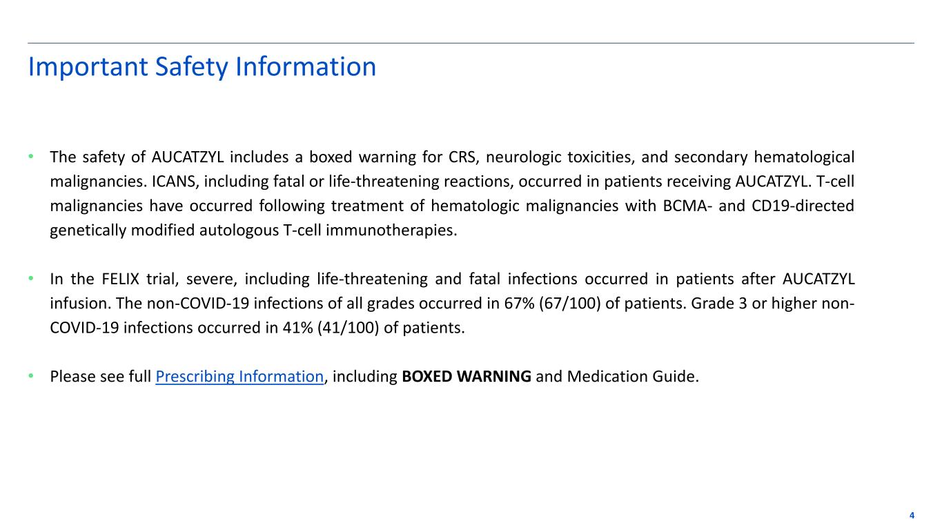 AUCATZYL® now FDA approved 3 ✓ AUCATZYL indicated for the treatment of adults with relapsed or refractory B-cell precursor acute lymphoblastic leukemia (B-ALL) ✓ First chimeric antigen receptor T-cell (CAR T) therapy approved by the FDA with no requirement for a REMS program (Risk Evaluation Mitigation Strategy) ✓ Novel and differentiated mechanism of action: first and currently only approved CD19 CAR T with a fast off-rate ✓ First and currently only approved CAR T therapy with customized, tumor-burden guided dosing Please see full prescribing information Prescribing information