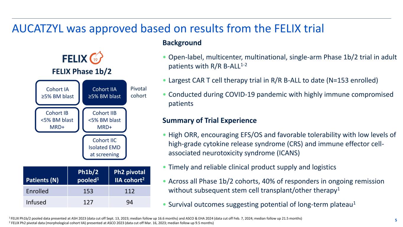 Important Safety Information 4 • The safety of AUCATZYL includes a boxed warning for CRS, neurologic toxicities, and secondary hematological malignancies. ICANS, including fatal or life-threatening reactions, occurred in patients receiving AUCATZYL. T-cell malignancies have occurred following treatment of hematologic malignancies with BCMA- and CD19-directed genetically modified autologous T-cell immunotherapies. • In the FELIX trial, severe, including life-threatening and fatal infections occurred in patients after AUCATZYL infusion. The non-COVID-19 infections of all grades occurred in 67% (67/100) of patients. Grade 3 or higher non- COVID-19 infections occurred in 41% (41/100) of patients. • Please see full Prescribing Information, including BOXED WARNING and Medication Guide.