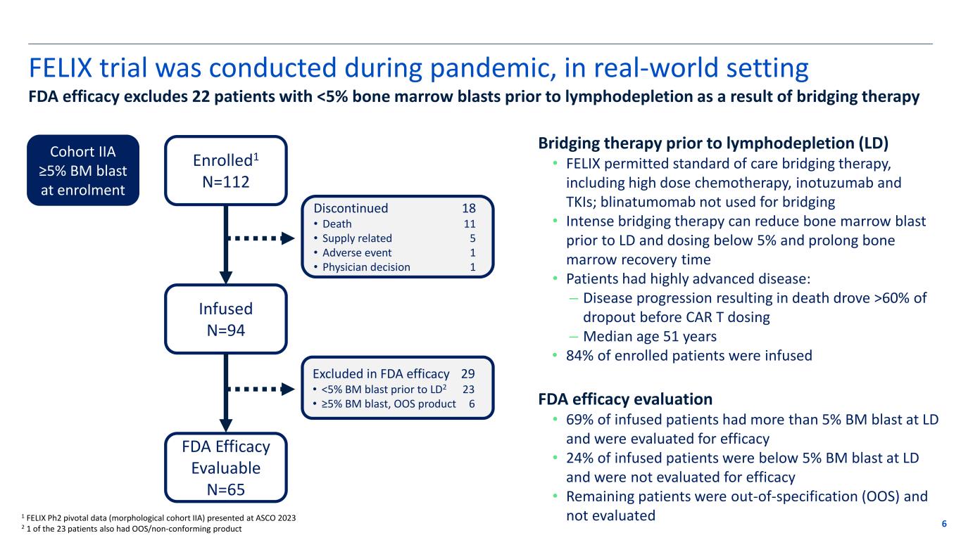 AUCATZYL was approved based on results from the FELIX trial 5 FELIX Phase 1b/2 Cohort IA ≥5% BM blast 1 FELIX Ph1b/2 pooled data presented at ASH 2023 (data cut off Sept. 13, 2023; median follow up 16.6 months) and ASCO & EHA 2024 (data cut off Feb. 7, 2024; median follow up 21.5 months) 2 FELIX Ph2 pivotal data (morphological cohort IIA) presented at ASCO 2023 (data cut off Mar. 16, 2023; median follow up 9.5 months) Cohort IB <5% BM blast MRD+ Cohort IIA ≥5% BM blast Cohort IIB <5% BM blast MRD+ Cohort IIC Isolated EMD at screening Patients (N) Ph1b/2 pooled1 Ph2 pivotal IIA cohort2 Enrolled 153 112 Infused 127 94 Pivotal cohort Background • Open-label, multicenter, multinational, single-arm Phase 1b/2 trial in adult patients with R/R B-ALL1-2 • Largest CAR T cell therapy trial in R/R B-ALL to date (N=153 enrolled) • Conducted during COVID-19 pandemic with highly immune compromised patients Summary of Trial Experience • High ORR, encouraging EFS/OS and favorable tolerability with low levels of high-grade cytokine release syndrome (CRS) and immune effector cell- associated neurotoxicity syndrome (ICANS) • Timely and reliable clinical product supply and logistics • Across all Phase 1b/2 cohorts, 40% of responders in ongoing remission without subsequent stem cell transplant/other therapy1 • Survival outcomes suggesting potential of long-term plateau1