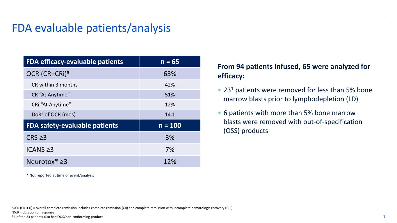 FELIX trial was conducted during pandemic, in real-world setting 6 FDA efficacy excludes 22 patients with <5% bone marrow blasts prior to lymphodepletion as a result of bridging therapy Enrolled1 N=112 Cohort IIA ≥5% BM blast at enrolment Infused N=94 Discontinued 18 • Death 11 • Supply related 5 • Adverse event 1 • Physician decision 1 1 FELIX Ph2 pivotal data (morphological cohort IIA) presented at ASCO 2023 2 1 of the 23 patients also had OOS/non-conforming product FDA Efficacy Evaluable N=65 Excluded in FDA efficacy 29 • <5% BM blast prior to LD2 23 • ≥5% BM blast, OOS product 6 Bridging therapy prior to lymphodepletion (LD) • FELIX permitted standard of care bridging therapy, including high dose chemotherapy, inotuzumab and TKIs; blinatumomab not used for bridging • Intense bridging therapy can reduce bone marrow blast prior to LD and dosing below 5% and prolong bone marrow recovery time • Patients had highly advanced disease: – Disease progression resulting in death drove >60% of dropout before CAR T dosing – Median age 51 years • 84% of enrolled patients were infused FDA efficacy evaluation • 69% of infused patients had more than 5% BM blast at LD and were evaluated for efficacy • 24% of infused patients were below 5% BM blast at LD and were not evaluated for efficacy • Remaining patients were out-of-specification (OOS) and not evaluated