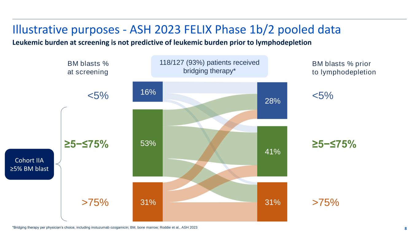 FDA evaluable patients/analysis 7 FDA efficacy-evaluable patients n = 65 OCR (CR+CRi)# 63% CR within 3 months 42% CR “At Anytime” 51% CRi “At Anytime” 12% DoR# of OCR (mos) 14.1 FDA safety-evaluable patients n = 100 CRS ≥3 3% ICANS ≥3 7% Neurotox* ≥3 12% * Not reported at time of event/analysis #OCR (CR+Cri) = overall complete remission includes complete remission (CR) and complete remission with incomplete hematologic recovery (CRi) #DoR = duration of response 1 1 of the 23 patients also had OOS/non-conforming product From 94 patients infused, 65 were analyzed for efficacy: • 231 patients were removed for less than 5% bone marrow blasts prior to lymphodepletion (LD) • 6 patients with more than 5% bone marrow blasts were removed with out-of-specification (OSS) products
