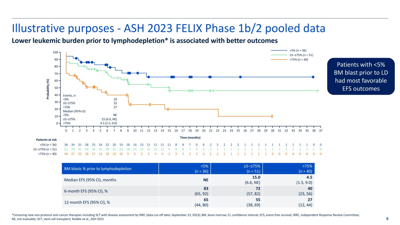 Illustrative purposes - ASH 2023 FELIX Phase 1b/2 pooled data 8 Leukemic burden at screening is not predictive of leukemic burden prior to lymphodepletion *Bridging therapy per physician’s choice, including inotuzumab ozogamicin; BM, bone marrow; Roddie et al., ASH 2023 16% 28% 53% 40% 31% 31% BM blasts % at screening BM blasts % prior to lymphodepletion 118/127 (93%) patients received bridging therapy* <5% ≥5−≤75% >75% 53% 31% 31% <5% ≥5−≤75% >75% 28% 41% 16% Cohort IIA ≥5% BM blast