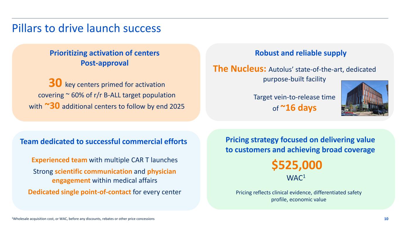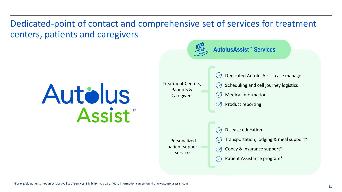Pillars to drive launch success 10 30 key centers primed for activation covering ~ 60% of r/r B-ALL target population with ~30 additional centers to follow by end 2025 Prioritizing activation of centers Post-approval Pricing reflects clinical evidence, differentiated safety profile, economic value $525,000 WAC1 Pricing strategy focused on delivering value to customers and achieving broad coverage Robust and reliable supply Team dedicated to successful commercial efforts Experienced team with multiple CAR T launches Strong scientific communication and physician engagement within medical affairs Dedicated single point-of-contact for every center 1Wholesale acquisition cost, or WAC, before any discounts, rebates or other price concessions The Nucleus: Autolus’ state-of-the-art, dedicated purpose-built facility Target vein-to-release time of ~16 days