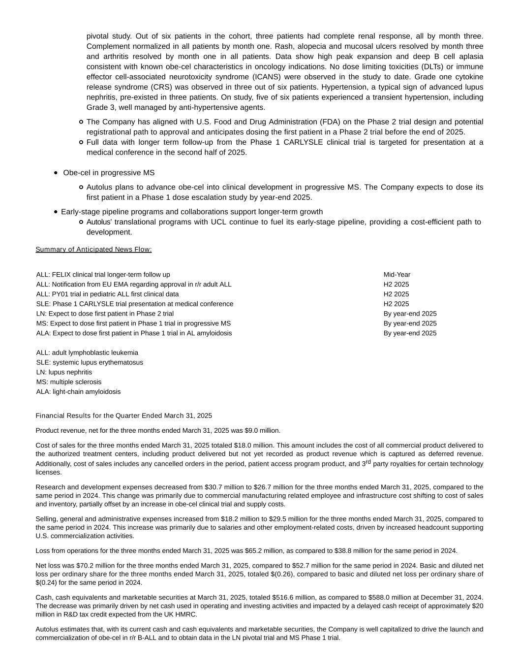 pivotal study. Out of six patients in the cohort, three patients had complete renal response, all by month three. Complement normalized in all patients by month one. Rash, alopecia and mucosal ulcers resolved by month three and arthritis resolved by month one in all patients. Data show high peak expansion and deep B cell aplasia consistent with known obe-cel characteristics in oncology indications. No dose limiting toxicities (DLTs) or immune effector cell-associated neurotoxicity syndrome (ICANS) were observed in the study to date. Grade one cytokine release syndrome (CRS) was observed in three out of six patients. Hypertension, a typical sign of advanced lupus nephritis, pre-existed in three patients. On study, five of six patients experienced a transient hypertension, including Grade 3, well managed by anti-hypertensive agents. The Company has aligned with U.S. Food and Drug Administration (FDA) on the Phase 2 trial design and potential registrational path to approval and anticipates dosing the first patient in a Phase 2 trial before the end of 2025.   Full data with longer term follow-up from the Phase 1 CARLYSLE clinical trial is targeted for presentation at a medical conference in the second half of 2025.   Obe-cel in progressive MS  Autolus plans to advance obe-cel into clinical development in progressive MS. The Company expects to dose its first patient in a Phase 1 dose escalation study by year-end 2025.   Early-stage pipeline programs and collaborations support longer-term growth Autolus’ translational programs with UCL continue to fuel its early-stage pipeline, providing a cost-efficient path to development. Summary of Anticipated News Flow:      ALL: FELIX clinical trial longer-term follow up Mid-Year ALL: Notification from EU EMA regarding approval in r/r adult ALL  H2 2025  ALL: PY01 trial in pediatric ALL first clinical data  H2 2025  SLE: Phase 1 CARLYSLE trial presentation at medical conference  H2 2025  LN: Expect to dose first patient in Phase 2 trial  By year-end 2025  MS: Expect to dose first patient in Phase 1 trial in progressive MS  By year-end 2025  ALA: Expect to dose first patient in Phase 1 trial in AL amyloidosis By year-end 2025       ALL: adult lymphoblastic leukemia   SLE: systemic lupus erythematosus   LN: lupus nephritis   MS: multiple sclerosis   ALA: light-chain amyloidosis   Financial Results for the Quarter Ended March 31, 2025 Product revenue, net for the three months ended March 31, 2025 was $9.0 million. Cost of sales for the three months ended March 31, 2025 totaled $18.0 million. This amount includes the cost of all commercial product delivered to the authorized treatment centers, including product delivered but not yet recorded as product revenue which is captured as deferred revenue. Additionally, cost of sales includes any cancelled orders in the period, patient access program product, and 3rd party royalties for certain technology licenses. Research and development expenses decreased from $30.7 million to $26.7 million for the three months ended March 31, 2025, compared to the same period in 2024. This change was primarily due to commercial manufacturing related employee and infrastructure cost shifting to cost of sales and inventory, partially offset by an increase in obe-cel clinical trial and supply costs. Selling, general and administrative expenses increased from $18.2 million to $29.5 million for the three months ended March 31, 2025, compared to the same period in 2024. This increase was primarily due to salaries and other employment-related costs, driven by increased headcount supporting U.S. commercialization activities. Loss from operations for the three months ended March 31, 2025 was $65.2 million, as compared to $38.8 million for the same period in 2024. Net loss was $70.2 million for the three months ended March 31, 2025, compared to $52.7 million for the same period in 2024. Basic and diluted net loss per ordinary share for the three months ended March 31, 2025, totaled $(0.26), compared to basic and diluted net loss per ordinary share of $(0.24) for the same period in 2024. Cash, cash equivalents and marketable securities at March 31, 2025, totaled $516.6 million, as compared to $588.0 million at December 31, 2024. The decrease was primarily driven by net cash used in operating and investing activities and impacted by a delayed cash receipt of approximately $20 million in R&D tax credit expected from the UK HMRC.   Autolus estimates that, with its current cash and cash equivalents and marketable securities, the Company is well capitalized to drive the launch and commercialization of obe-cel in r/r B-ALL and to obtain data in the LN pivotal trial and MS Phase 1 trial.