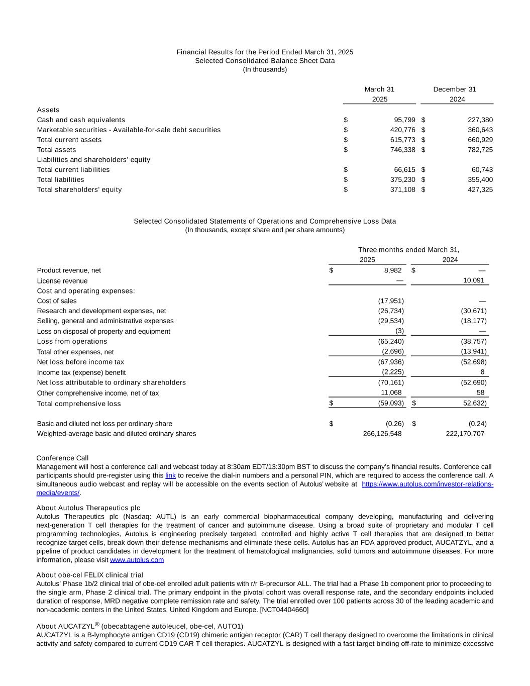 Financial Results for the Period Ended March 31, 2025 Selected Consolidated Balance Sheet Data (In thousands)                                     March 31 December 31               2025   2024 Assets                   Cash and cash equivalents             $ 95,799   $ 227,380 Marketable securities - Available-for-sale debt securities             $ 420,776   $ 360,643 Total current assets             $ 615,773   $ 660,929 Total assets             $ 746,338   $ 782,725 Liabilities and shareholders’ equity                   Total current liabilities             $ 66,615   $ 60,743 Total liabilities             $ 375,230   $ 355,400 Total shareholders' equity             $ 371,108   $ 427,325 Selected Consolidated Statements of Operations and Comprehensive Loss Data (In thousands, except share and per share amounts)                                 Three months ended March 31,                   2025       2024     Product revenue, net             $ 8,982    $ —    License revenue               —      10,091    Cost and operating expenses:                     Cost of sales               (17,951)     —    Research and development expenses, net               (26,734)     (30,671)   Selling, general and administrative expenses               (29,534)     (18,177)   Loss on disposal of property and equipment               (3)     —    Loss from operations               (65,240)     (38,757)   Total other expenses, net               (2,696)     (13,941)   Net loss before income tax               (67,936)     (52,698)   Income tax (expense) benefit               (2,225)     8    Net loss attributable to ordinary shareholders               (70,161)     (52,690)   Other comprehensive income, net of tax               11,068      58    Total comprehensive loss             $ (59,093)   $ 52,632)                         Basic and diluted net loss per ordinary share             $ (0.26)   $ (0.24)   Weighted-average basic and diluted ordinary shares               266,126,548      222,170,707    Conference Call Management will host a conference call and webcast today at 8:30am EDT/13:30pm BST to discuss the company’s financial results. Conference call participants should pre-register using this link to receive the dial-in numbers and a personal PIN, which are required to access the conference call. A simultaneous audio webcast and replay will be accessible on the events section of Autolus’ website at https://www.autolus.com/investor-relations- media/events/. About Autolus Therapeutics plc Autolus Therapeutics plc   (Nasdaq: AUTL) is an early commercial biopharmaceutical company developing, manufacturing and delivering next-generation T cell therapies for the treatment of cancer and autoimmune disease. Using a broad suite of proprietary and modular T cell programming technologies, Autolus is engineering precisely targeted, controlled and highly active T cell therapies that are designed to better recognize target cells, break down their defense mechanisms and eliminate these cells. Autolus has an FDA approved product, AUCATZYL, and a pipeline of product candidates in development for the treatment of hematological malignancies, solid tumors and autoimmune diseases. For more information, please visit www.autolus.com About obe-cel FELIX clinical trial Autolus’ Phase 1b/2 clinical trial of obe-cel enrolled adult patients with r/r B-precursor ALL. The trial had a Phase 1b component prior to proceeding to the single arm, Phase 2 clinical trial. The primary endpoint in the pivotal cohort was overall response rate, and the secondary endpoints included duration of response, MRD negative complete remission rate and safety. The trial enrolled over 100 patients across 30 of the leading academic and non-academic centers in the United States, United Kingdom and Europe. [NCT04404660] About AUCATZYL® (obecabtagene autoleucel, obe-cel, AUTO1) AUCATZYL is a B-lymphocyte antigen CD19 (CD19) chimeric antigen receptor (CAR) T cell therapy designed to overcome the limitations in clinical activity and safety compared to current CD19 CAR T cell therapies. AUCATZYL is designed with a fast target binding off-rate to minimize excessive