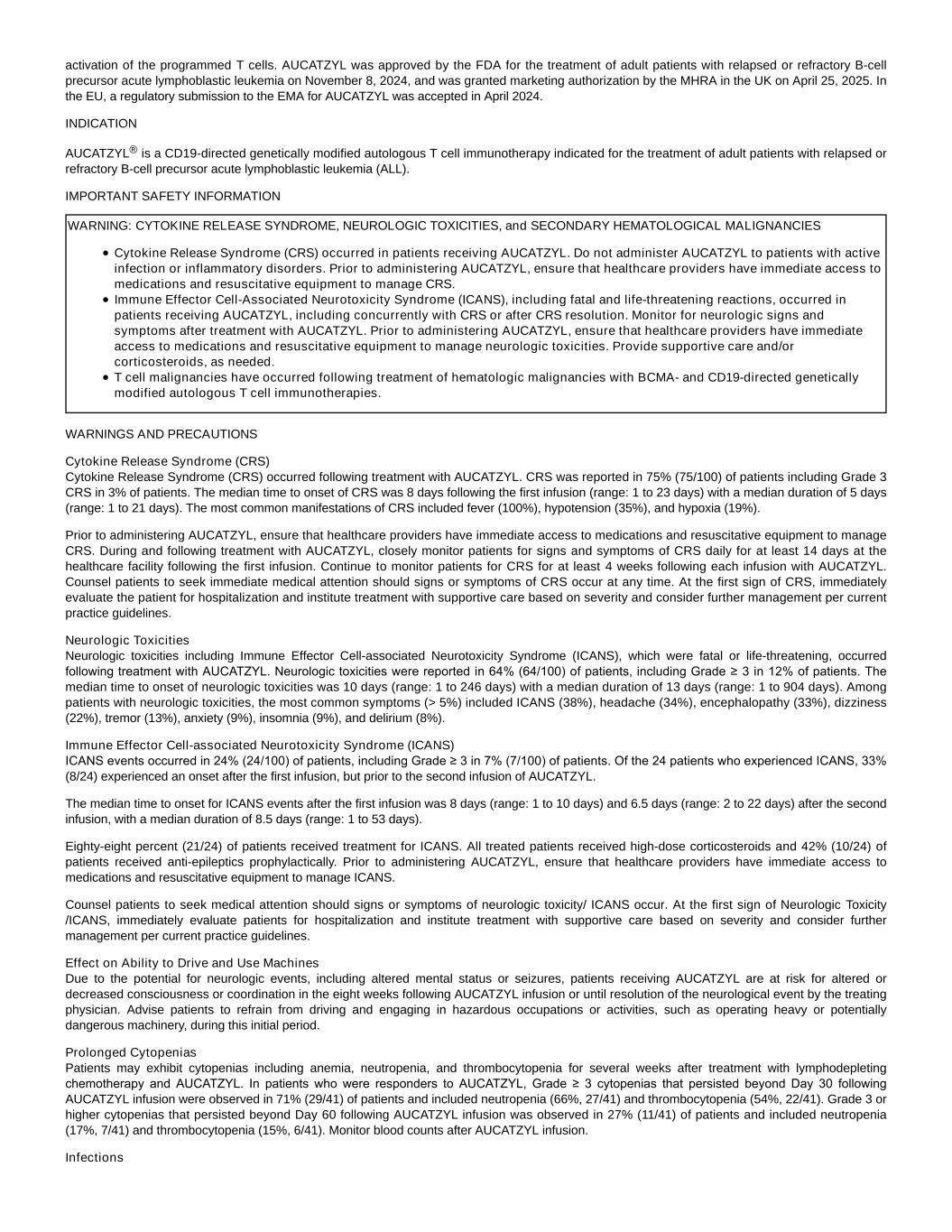 activation of the programmed T cells. AUCATZYL was approved by the FDA for the treatment of adult patients with relapsed or refractory B-cell precursor acute lymphoblastic leukemia on November 8, 2024, and was granted marketing authorization by the MHRA in the UK on April 25, 2025. In the EU, a regulatory submission to the EMA for AUCATZYL was accepted in April 2024. INDICATION AUCATZYL® is a CD19-directed genetically modified autologous T cell immunotherapy indicated for the treatment of adult patients with relapsed or refractory B-cell precursor acute lymphoblastic leukemia (ALL). IMPORTANT SAFETY INFORMATION WARNING: CYTOKINE RELEASE SYNDROME, NEUROLOGIC TOXICITIES, and SECONDARY HEMATOLOGICAL MALIGNANCIES Cytokine Release Syndrome (CRS) occurred in patients receiving AUCATZYL. Do not administer AUCATZYL to patients with active infection or inflammatory disorders. Prior to administering AUCATZYL, ensure that healthcare providers have immediate access to medications and resuscitative equipment to manage CRS. Immune Effector Cell-Associated Neurotoxicity Syndrome (ICANS), including fatal and life-threatening reactions, occurred in patients receiving AUCATZYL, including concurrently with CRS or after CRS resolution. Monitor for neurologic signs and symptoms after treatment with AUCATZYL. Prior to administering AUCATZYL, ensure that healthcare providers have immediate access to medications and resuscitative equipment to manage neurologic toxicities. Provide supportive care and/or corticosteroids, as needed. T cell malignancies have occurred following treatment of hematologic malignancies with BCMA- and CD19-directed genetically modified autologous T cell immunotherapies. WARNINGS AND PRECAUTIONS Cytokine Release Syndrome (CRS) Cytokine Release Syndrome (CRS) occurred following treatment with AUCATZYL. CRS was reported in 75% (75/100) of patients including Grade 3 CRS in 3% of patients. The median time to onset of CRS was 8 days following the first infusion (range: 1 to 23 days) with a median duration of 5 days (range: 1 to 21 days). The most common manifestations of CRS included fever (100%), hypotension (35%), and hypoxia (19%). Prior to administering AUCATZYL, ensure that healthcare providers have immediate access to medications and resuscitative equipment to manage CRS. During and following treatment with AUCATZYL, closely monitor patients for signs and symptoms of CRS daily for at least 14 days at the healthcare facility following the first infusion. Continue to monitor patients for CRS for at least 4 weeks following each infusion with AUCATZYL. Counsel patients to seek immediate medical attention should signs or symptoms of CRS occur at any time. At the first sign of CRS, immediately evaluate the patient for hospitalization and institute treatment with supportive care based on severity and consider further management per current practice guidelines. Neurologic Toxicities Neurologic toxicities including Immune Effector Cell-associated Neurotoxicity Syndrome (ICANS), which were fatal or life-threatening, occurred following treatment with AUCATZYL. Neurologic toxicities were reported in 64% (64/100) of patients, including Grade ≥ 3 in 12% of patients. The median time to onset of neurologic toxicities was 10 days (range: 1 to 246 days) with a median duration of 13 days (range: 1 to 904 days). Among patients with neurologic toxicities, the most common symptoms (> 5%) included ICANS (38%), headache (34%), encephalopathy (33%), dizziness (22%), tremor (13%), anxiety (9%), insomnia (9%), and delirium (8%). Immune Effector Cell-associated Neurotoxicity Syndrome (ICANS) ICANS events occurred in 24% (24/100) of patients, including Grade ≥ 3 in 7% (7/100) of patients. Of the 24 patients who experienced ICANS, 33% (8/24) experienced an onset after the first infusion, but prior to the second infusion of AUCATZYL. The median time to onset for ICANS events after the first infusion was 8 days (range: 1 to 10 days) and 6.5 days (range: 2 to 22 days) after the second infusion, with a median duration of 8.5 days (range: 1 to 53 days). Eighty-eight percent (21/24) of patients received treatment for ICANS. All treated patients received high-dose corticosteroids and 42% (10/24) of patients received anti-epileptics prophylactically. Prior to administering AUCATZYL, ensure that healthcare providers have immediate access to medications and resuscitative equipment to manage ICANS. Counsel patients to seek medical attention should signs or symptoms of neurologic toxicity/ ICANS occur. At the first sign of Neurologic Toxicity /ICANS, immediately evaluate patients for hospitalization and institute treatment with supportive care based on severity and consider further management per current practice guidelines. Effect on Ability to Drive and Use Machines Due to the potential for neurologic events, including altered mental status or seizures, patients receiving AUCATZYL are at risk for altered or decreased consciousness or coordination in the eight weeks following AUCATZYL infusion or until resolution of the neurological event by the treating physician. Advise patients to refrain from driving and engaging in hazardous occupations or activities, such as operating heavy or potentially dangerous machinery, during this initial period. Prolonged Cytopenias Patients may exhibit cytopenias including anemia, neutropenia, and thrombocytopenia for several weeks after treatment with lymphodepleting chemotherapy and AUCATZYL. In patients who were responders to AUCATZYL, Grade ≥ 3 cytopenias that persisted beyond Day 30 following AUCATZYL infusion were observed in 71% (29/41) of patients and included neutropenia (66%, 27/41) and thrombocytopenia (54%, 22/41). Grade 3 or higher cytopenias that persisted beyond Day 60 following AUCATZYL infusion was observed in 27% (11/41) of patients and included neutropenia (17%, 7/41) and thrombocytopenia (15%, 6/41). Monitor blood counts after AUCATZYL infusion. Infections