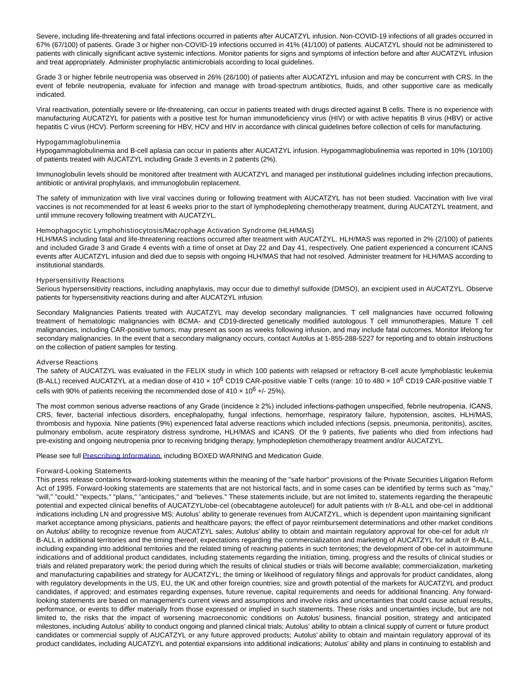Severe, including life-threatening and fatal infections occurred in patients after AUCATZYL infusion. Non-COVID-19 infections of all grades occurred in 67% (67/100) of patients. Grade 3 or higher non-COVID-19 infections occurred in 41% (41/100) of patients. AUCATZYL should not be administered to patients with clinically significant active systemic infections. Monitor patients for signs and symptoms of infection before and after AUCATZYL infusion and treat appropriately. Administer prophylactic antimicrobials according to local guidelines. Grade 3 or higher febrile neutropenia was observed in 26% (26/100) of patients after AUCATZYL infusion and may be concurrent with CRS. In the event of febrile neutropenia, evaluate for infection and manage with broad-spectrum antibiotics, fluids, and other supportive care as medically indicated. Viral reactivation, potentially severe or life-threatening, can occur in patients treated with drugs directed against B cells. There is no experience with manufacturing AUCATZYL for patients with a positive test for human immunodeficiency virus (HIV) or with active hepatitis B virus (HBV) or active hepatitis C virus (HCV). Perform screening for HBV, HCV and HIV in accordance with clinical guidelines before collection of cells for manufacturing. Hypogammaglobulinemia Hypogammaglobulinemia and B-cell aplasia can occur in patients after AUCATZYL infusion. Hypogammaglobulinemia was reported in 10% (10/100) of patients treated with AUCATZYL including Grade 3 events in 2 patients (2%). Immunoglobulin levels should be monitored after treatment with AUCATZYL and managed per institutional guidelines including infection precautions, antibiotic or antiviral prophylaxis, and immunoglobulin replacement. The safety of immunization with live viral vaccines during or following treatment with AUCATZYL has not been studied. Vaccination with live viral vaccines is not recommended for at least 6 weeks prior to the start of lymphodepleting chemotherapy treatment, during AUCATZYL treatment, and until immune recovery following treatment with AUCATZYL. Hemophagocytic Lymphohistiocytosis/Macrophage Activation Syndrome (HLH/MAS) HLH/MAS including fatal and life-threatening reactions occurred after treatment with AUCATZYL. HLH/MAS was reported in 2% (2/100) of patients and included Grade 3 and Grade 4 events with a time of onset at Day 22 and Day 41, respectively. One patient experienced a concurrent ICANS events after AUCATZYL infusion and died due to sepsis with ongoing HLH/MAS that had not resolved. Administer treatment for HLH/MAS according to institutional standards. Hypersensitivity Reactions Serious hypersensitivity reactions, including anaphylaxis, may occur due to dimethyl sulfoxide (DMSO), an excipient used in AUCATZYL. Observe patients for hypersensitivity reactions during and after AUCATZYL infusion. Secondary Malignancies Patients treated with AUCATZYL may develop secondary malignancies. T cell malignancies have occurred following treatment of hematologic malignancies with BCMA- and CD19-directed genetically modified autologous T cell immunotherapies. Mature T cell malignancies, including CAR-positive tumors, may present as soon as weeks following infusion, and may include fatal outcomes. Monitor lifelong for secondary malignancies. In the event that a secondary malignancy occurs, contact Autolus at 1-855-288-5227 for reporting and to obtain instructions on the collection of patient samples for testing. Adverse Reactions The safety of AUCATZYL was evaluated in the FELIX study in which 100 patients with relapsed or refractory B-cell acute lymphoblastic leukemia (B-ALL) received AUCATZYL at a median dose of 410 × 106 CD19 CAR-positive viable T cells (range: 10 to 480 × 106 CD19 CAR-positive viable T cells with 90% of patients receiving the recommended dose of 410 × 106 +/- 25%). The most common serious adverse reactions of any Grade (incidence ≥ 2%) included infections-pathogen unspecified, febrile neutropenia, ICANS, CRS, fever, bacterial infectious disorders, encephalopathy, fungal infections, hemorrhage, respiratory failure, hypotension, ascites, HLH/MAS, thrombosis and hypoxia. Nine patients (9%) experienced fatal adverse reactions which included infections (sepsis, pneumonia, peritonitis), ascites, pulmonary embolism, acute respiratory distress syndrome, HLH/MAS and ICANS. Of the 9 patients, five patients who died from infections had pre-existing and ongoing neutropenia prior to receiving bridging therapy, lymphodepletion chemotherapy treatment and/or AUCATZYL. Please see full Prescribing Information, including BOXED WARNING and Medication Guide. Forward-Looking Statements   This press release contains forward-looking statements within the meaning of the "safe harbor" provisions of the Private Securities Litigation Reform Act of 1995. Forward-looking statements are statements that are not historical facts, and in some cases can be identified by terms such as "may," "will," "could," "expects," "plans," "anticipates," and "believes." These statements include, but are not limited to, statements regarding the therapeutic potential and expected clinical benefits of AUCATZYL/obe-cel (obecabtagene autoleucel) for adult patients with r/r B-ALL and obe-cel in additional indications including LN and progressive MS; Autolus’ ability to generate revenues from AUCATZYL, which is dependent upon maintaining significant market acceptance among physicians, patients and healthcare payors; the effect of payor reimbursement determinations and other market conditions on Autolus’ ability to recognize revenue from AUCATZYL sales; Autolus’ ability to obtain and maintain regulatory approval for obe-cel for adult r/r B-ALL in additional territories and the timing thereof; expectations regarding the commercialization and marketing of AUCATZYL for adult r/r B-ALL, including expanding into additional territories and the related timing of reaching patients in such territories; the devel