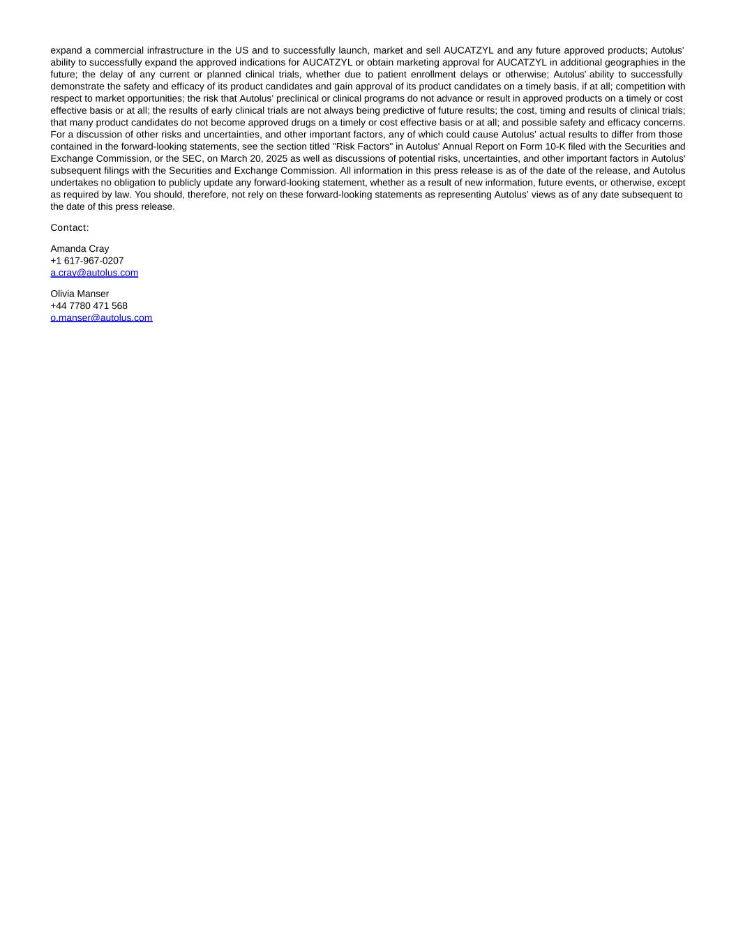 expand a commercial infrastructure in the US and to successfully launch, market and sell AUCATZYL and any future approved products; Autolus’ ability to successfully expand the approved indications for AUCATZYL or obtain marketing approval for AUCATZYL in additional geographies in the future; the delay of any current or planned clinical trials, whether due to patient enrollment delays or otherwise; Autolus’ ability to successfully demonstrate the safety and efficacy of its product candidates and gain approval of its product candidates on a timely basis, if at all; competition with respect to market opportunities; the risk that Autolus’ preclinical or clinical programs do not advance or result in approved products on a timely or cost effective basis or at all; the results of early clinical trials are not always being predictive of future results; the cost, timing and results of clinical trials; that many product candidates do not become approved drugs on a timely or cost effective basis or at all; and possible safety and efficacy concerns. For a discussion of other risks and uncertainties, and other important factors, any of which could cause Autolus’ actual results to differ from those contained in the forward-looking statements, see the section titled "Risk Factors" in Autolus' Annual Report on Form 10-K filed with the Securities and Exchange Commission, or the SEC, on March 20, 2025 as well as discussions of potential risks, uncertainties, and other important factors in Autolus' subsequent filings with the Securities and Exchange Commission. All information in this press release is as of the date of the release, and Autolus undertakes no obligation to publicly update any forward-looking statement, whether as a result of new information, future events, or otherwise, except as required by law. You should, therefore, not rely on these forward-looking statements as representing Autolus’ views as of any date subsequent to the date of this press release.    Contact:   Amanda Cray  +1 617-967-0207  a.cray@autolus.com  Olivia Manser  +44 7780 471 568  o.manser@autolus.com
