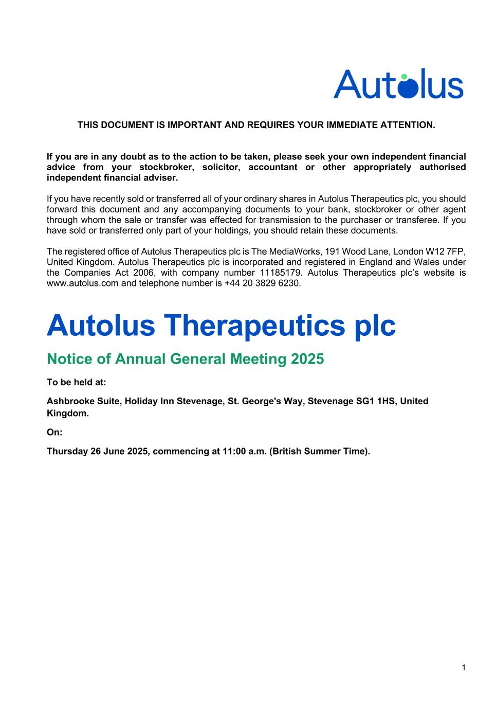 1 THIS DOCUMENT IS IMPORTANT AND REQUIRES YOUR IMMEDIATE ATTENTION. If you are in any doubt as to the action to be taken, please seek your own independent financial advice from your stockbroker, solicitor, accountant or other appropriately authorised independent financial adviser. If you have recently sold or transferred all of your ordinary shares in Autolus Therapeutics plc, you should forward this document and any accompanying documents to your bank, stockbroker or other agent through whom the sale or transfer was effected for transmission to the purchaser or transferee. If you have sold or transferred only part of your holdings, you should retain these documents. The registered office of Autolus Therapeutics plc is The MediaWorks, 191 Wood Lane, London W12 7FP, United Kingdom. Autolus Therapeutics plc is incorporated and registered in England and Wales under the Companies Act 2006, with company number 11185179. Autolus Therapeutics plc’s website is www.autolus.com and telephone number is +44 20 3829 6230. Autolus Therapeutics plc Notice of Annual General Meeting 2025 To be held at: Ashbrooke Suite, Holiday Inn Stevenage, St. George's Way, Stevenage SG1 1HS, United Kingdom. On: Thursday 26 June 2025, commencing at 11:00 a.m. (British Summer Time).