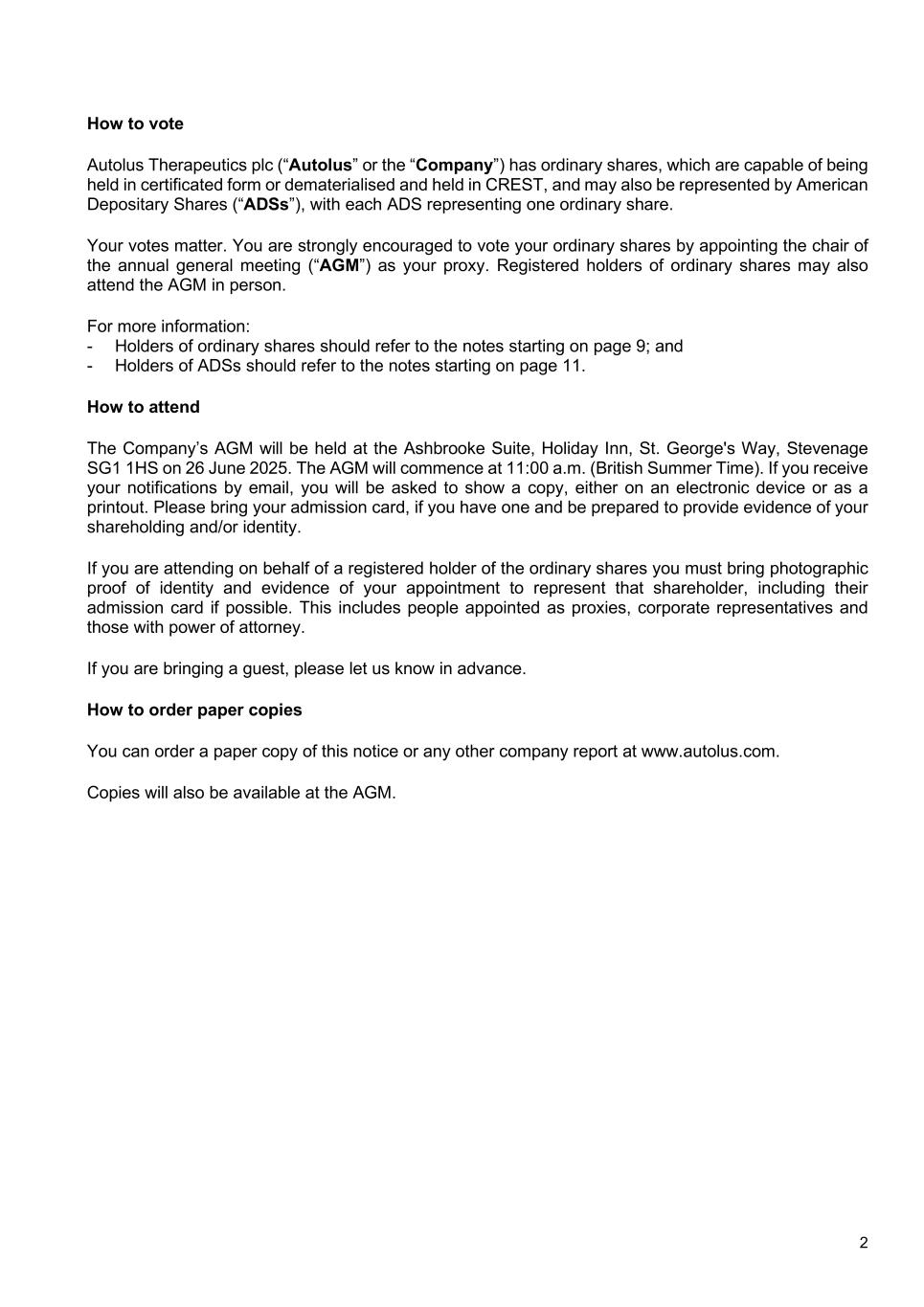 2 How to vote Autolus Therapeutics plc (“Autolus” or the “Company”) has ordinary shares, which are capable of being held in certificated form or dematerialised and held in CREST, and may also be represented by American Depositary Shares (“ADSs”), with each ADS representing one ordinary share. Your votes matter. You are strongly encouraged to vote your ordinary shares by appointing the chair of the annual general meeting (“AGM”) as your proxy. Registered holders of ordinary shares may also attend the AGM in person. For more information: - Holders of ordinary shares should refer to the notes starting on page 9; and - Holders of ADSs should refer to the notes starting on page 11. How to attend The Company’s AGM will be held at the Ashbrooke Suite, Holiday Inn, St. George's Way, Stevenage SG1 1HS on 26 June 2025. The AGM will commence at 11:00 a.m. (British Summer Time). If you receive your notifications by email, you will be asked to show a copy, either on an electronic device or as a printout. Please bring your admission card, if you have one and be prepared to provide evidence of your shareholding and/or identity. If you are attending on behalf of a registered holder of the ordinary shares you must bring photographic proof of identity and evidence of your appointment to represent that shareholder, including their admission card if possible. This includes people appointed as proxies, corporate representatives and those with power of attorney. If you are bringing a guest, please let us know in advance. How to order paper copies You can order a paper copy of this notice or any other company report at www.autolus.com. Copies will also be available at the AGM.