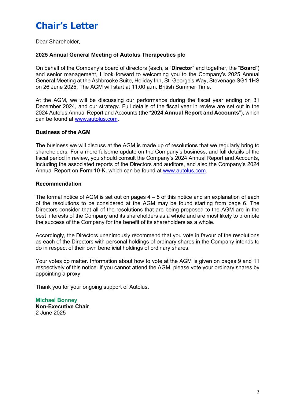 Chair’s Letter 3 Dear Shareholder, 2025 Annual General Meeting of Autolus Therapeutics plc On behalf of the Company’s board of directors (each, a “Director” and together, the “Board”) and senior management, I look forward to welcoming you to the Company’s 2025 Annual General Meeting at the Ashbrooke Suite, Holiday Inn, St. George's Way, Stevenage SG1 1HS on 26 June 2025. The AGM will start at 11:00 a.m. British Summer Time. At the AGM, we will be discussing our performance during the fiscal year ending on 31 December 2024, and our strategy. Full details of the fiscal year in review are set out in the 2024 Autolus Annual Report and Accounts (the “2024 Annual Report and Accounts”), which can be found at www.autolus.com. Business of the AGM The business we will discuss at the AGM is made up of resolutions that we regularly bring to shareholders. For a more fulsome update on the Company’s business, and full details of the fiscal period in review, you should consult the Company’s 2024 Annual Report and Accounts, including the associated reports of the Directors and auditors, and also the Company’s 2024 Annual Report on Form 10-K, which can be found at www.autolus.com. Recommendation The formal notice of AGM is set out on pages 4 – 5 of this notice and an explanation of each of the resolutions to be considered at the AGM may be found starting from page 6. The Directors consider that all of the resolutions that are being proposed to the AGM are in the best interests of the Company and its shareholders as a whole and are most likely to promote the success of the Company for the benefit of its shareholders as a whole. Accordingly, the Directors unanimously recommend that you vote in favour of the resolutions as each of the Directors with personal holdings of ordinary shares in the Company intends to do in respect of their own beneficial holdings of ordinary shares. Your votes do matter. Information about how to vote at the AGM is given on pages 9 and 11 respectively of this notice. If you cannot attend the AGM, please vote your ordinary shares by appointing a proxy. Thank you for your ongoing support of Autolus. Michael Bonney Non-Executive Chair 2 June 2025