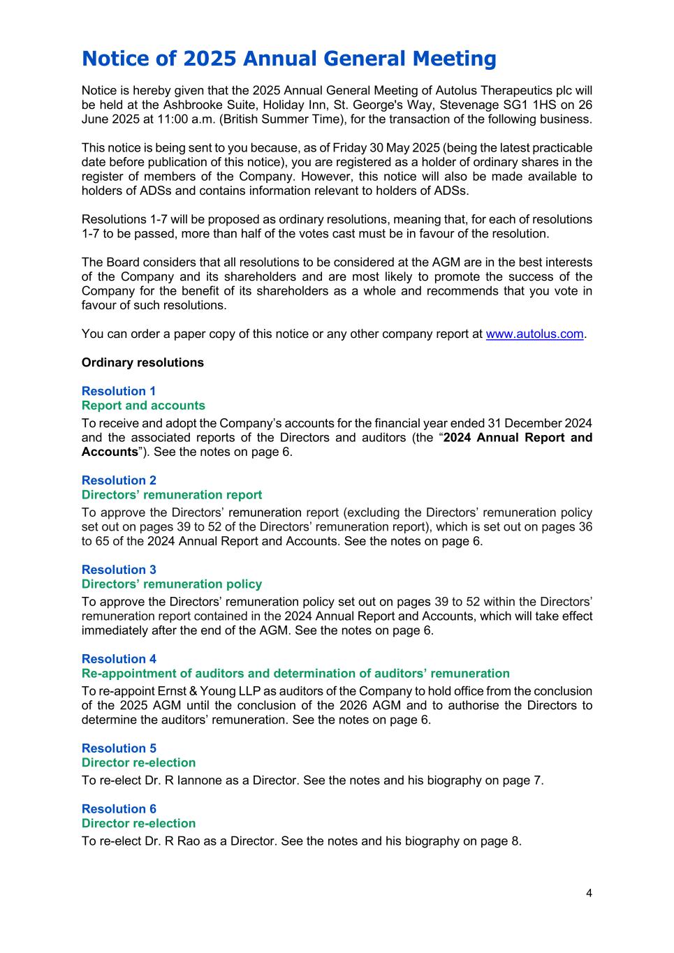 Notice of 2025 Annual General Meeting 4 Notice is hereby given that the 2025 Annual General Meeting of Autolus Therapeutics plc will be held at the Ashbrooke Suite, Holiday Inn, St. George's Way, Stevenage SG1 1HS on 26 June 2025 at 11:00 a.m. (British Summer Time), for the transaction of the following business. This notice is being sent to you because, as of Friday 30 May 2025 (being the latest practicable date before publication of this notice), you are registered as a holder of ordinary shares in the register of members of the Company. However, this notice will also be made available to holders of ADSs and contains information relevant to holders of ADSs. Resolutions 1-7 will be proposed as ordinary resolutions, meaning that, for each of resolutions 1-7 to be passed, more than half of the votes cast must be in favour of the resolution. The Board considers that all resolutions to be considered at the AGM are in the best interests of the Company and its shareholders and are most likely to promote the success of the Company for the benefit of its shareholders as a whole and recommends that you vote in favour of such resolutions. You can order a paper copy of this notice or any other company report at www.autolus.com. Ordinary resolutions Resolution 1 Report and accounts To receive and adopt the Company’s accounts for the financial year ended 31 December 2024 and the associated reports of the Directors and auditors (the “2024 Annual Report and Accounts”). See the notes on page 6. Resolution 2 Directors’ remuneration report To approve the Directors’ remuneration report (excluding the Directors’ remuneration policy set out on pages 39 to 52 of the Directors’ remuneration report), which is set out on pages 36 to 65 of the 2024 Annual Report and Accounts. See the notes on page 6. Resolution 3 Directors’ remuneration policy To approve the Directors’ remuneration policy set out on pages 39 to 52 within the Directors’ remuneration report contained in the 2024 Annual Report and Accounts, which will take effect immediately after the end of the AGM. See the notes on page 6. Resolution 4 Re-appointment of auditors and determination of auditors’ remuneration To re-appoint Ernst & Young LLP as auditors of the Company to hold office from the conclusion of the 2025 AGM until the conclusion of the 2026 AGM and to authorise the Directors to determine the auditors’ remuneration. See the notes on page 6. Resolution 5 Director re-election To re-elect Dr. R Iannone as a Director. See the notes and his biography on page 7. Resolution 6 Director re-election To re-elect Dr. R Rao as a Director. See the notes and his biography on page 8.