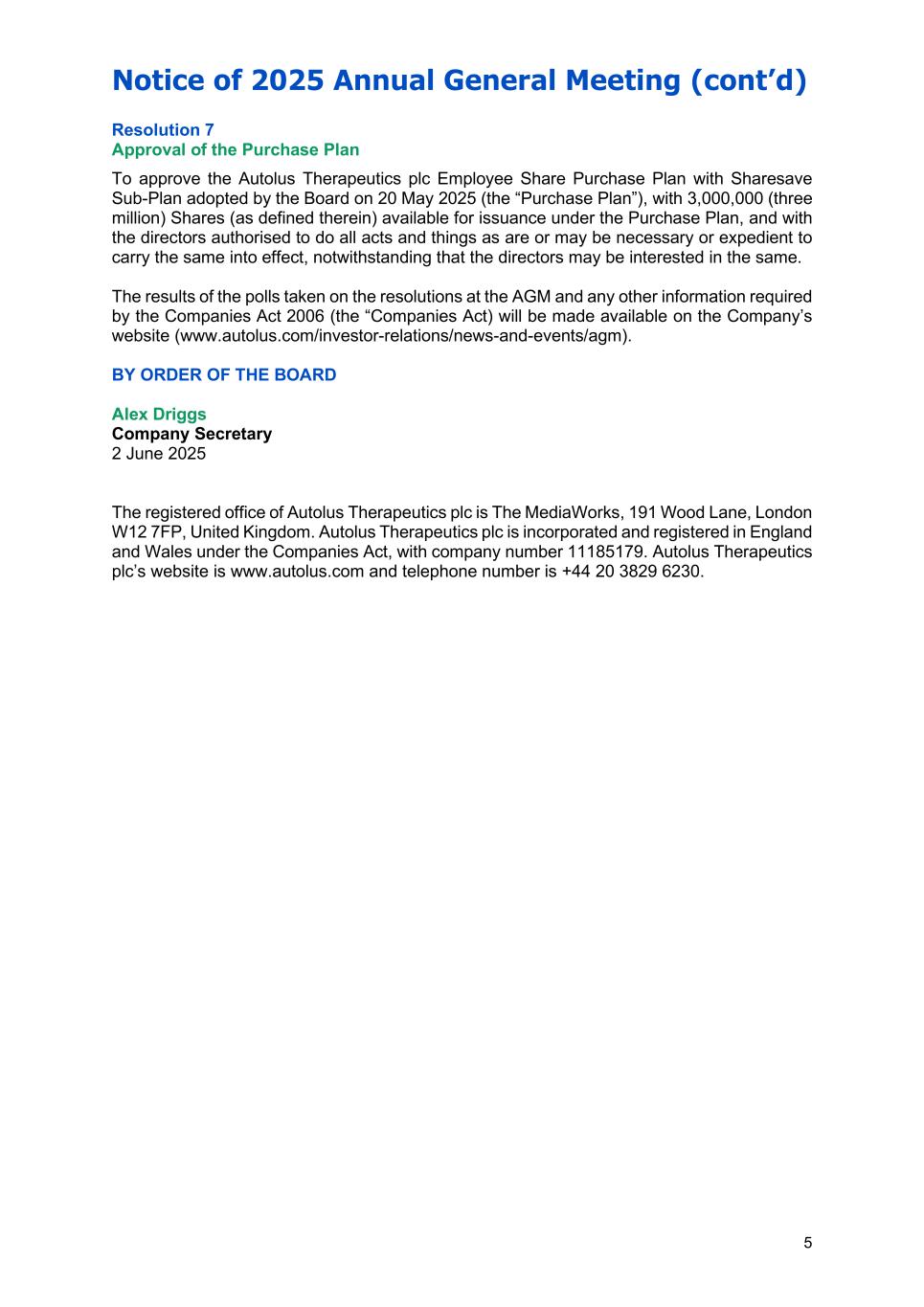 Notice of 2025 Annual General Meeting (cont’d) 5 Resolution 7 Approval of the Purchase Plan To approve the Autolus Therapeutics plc Employee Share Purchase Plan with Sharesave Sub-Plan adopted by the Board on 20 May 2025 (the “Purchase Plan”), with 3,000,000 (three million) Shares (as defined therein) available for issuance under the Purchase Plan, and with the directors authorised to do all acts and things as are or may be necessary or expedient to carry the same into effect, notwithstanding that the directors may be interested in the same. The results of the polls taken on the resolutions at the AGM and any other information required by the Companies Act 2006 (the “Companies Act) will be made available on the Company’s website (www.autolus.com/investor-relations/news-and-events/agm). BY ORDER OF THE BOARD Alex Driggs Company Secretary 2 June 2025 The registered office of Autolus Therapeutics plc is The MediaWorks, 191 Wood Lane, London W12 7FP, United Kingdom. Autolus Therapeutics plc is incorporated and registered in England and Wales under the Companies Act, with company number 11185179. Autolus Therapeutics plc’s website is www.autolus.com and telephone number is +44 20 3829 6230.