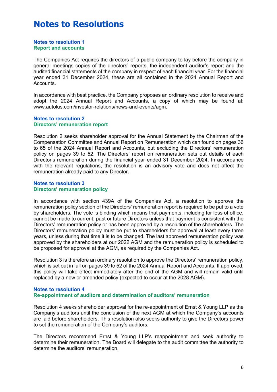 Notes to Resolutions 6 Notes to resolution 1 Report and accounts The Companies Act requires the directors of a public company to lay before the company in general meetings copies of the directors’ reports, the independent auditor’s report and the audited financial statements of the company in respect of each financial year. For the financial year ended 31 December 2024, these are all contained in the 2024 Annual Report and Accounts. In accordance with best practice, the Company proposes an ordinary resolution to receive and adopt the 2024 Annual Report and Accounts, a copy of which may be found at: www.autolus.com/investor-relations/news-and-events/agm. Notes to resolution 2 Directors’ remuneration report Resolution 2 seeks shareholder approval for the Annual Statement by the Chairman of the Compensation Committee and Annual Report on Remuneration which can found on pages 36 to 65 of the 2024 Annual Report and Accounts, but excluding the Directors’ remuneration policy on pages 39 to 52. The Directors’ report on remuneration sets out details of each Director’s remuneration during the financial year ended 31 December 2024. In accordance with the relevant regulations, the resolution is an advisory vote and does not affect the remuneration already paid to any Director. Notes to resolution 3 Directors’ remuneration policy In accordance with section 439A of the Companies Act, a resolution to approve the remuneration policy section of the Directors’ remuneration report is required to be put to a vote by shareholders. The vote is binding which means that payments, including for loss of office, cannot be made to current, past or future Directors unless that payment is consistent with the Directors’ remuneration policy or has been approved by a resolution of the shareholders. The Directors’ remuneration policy must be put to shareholders for approval at least every three years, unless during that time it is to be changed. The last approved remuneration policy was approved by the shareholders at our 2022 AGM and the remuneration policy is scheduled to be proposed for approval at the AGM, as required by the Companies Act. Resolution 3 is therefore an ordinary resolution to approve the Directors’ remuneration policy, which is set out in full on pages 39 to 52 of the 2024 Annual Report and Accounts. If approved, this policy will take effect immediately after the end of the AGM and will remain valid until replaced by a new or amended policy (expected to occur at the 2028 AGM). Notes to resolution 4 Re-appointment of auditors and determination of auditors’ remuneration Resolution 4 seeks shareholder approval for the re-appointment of Ernst & Young LLP as the Company’s auditors until the conclusion of the next AGM at which the Company’s accounts are laid before shareholders. This resolution also seeks authority to give the Directors power to set the remuneration of the Company’s auditors. The Directors recommend Ernst & Young LLP’s reappointment and seek authority to determine their remuneration. The Board will delegate to the audit committee the authority to determine the auditors’ remuneration.