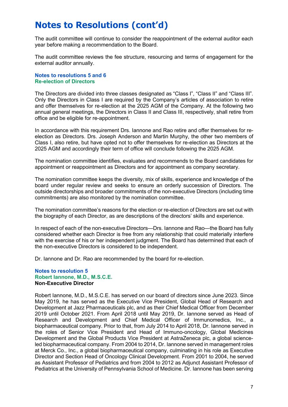 Notes to Resolutions (cont’d) 7 The audit committee will continue to consider the reappointment of the external auditor each year before making a recommendation to the Board. The audit committee reviews the fee structure, resourcing and terms of engagement for the external auditor annually. Notes to resolutions 5 and 6 Re-election of Directors The Directors are divided into three classes designated as “Class I”, “Class II” and “Class III”. Only the Directors in Class I are required by the Company’s articles of association to retire and offer themselves for re-election at the 2025 AGM of the Company. At the following two annual general meetings, the Directors in Class II and Class III, respectively, shall retire from office and be eligible for re-appointment. In accordance with this requirement Drs. Iannone and Rao retire and offer themselves for re- election as Directors. Drs. Joseph Anderson and Martin Murphy, the other two members of Class I, also retire, but have opted not to offer themselves for re-election as Directors at the 2025 AGM and accordingly their term of office will conclude following the 2025 AGM. The nomination committee identifies, evaluates and recommends to the Board candidates for appointment or reappointment as Directors and for appointment as company secretary. The nomination committee keeps the diversity, mix of skills, experience and knowledge of the board under regular review and seeks to ensure an orderly succession of Directors. The outside directorships and broader commitments of the non-executive Directors (including time commitments) are also monitored by the nomination committee. The nomination committee’s reasons for the election or re-election of Directors are set out with the biography of each Director, as are descriptions of the directors’ skills and experience. In respect of each of the non-executive Directors—Drs. Iannone and Rao—the Board has fully considered whether each Director is free from any relationship that could materially interfere with the exercise of his or her independent judgment. The Board has determined that each of the non-executive Directors is considered to be independent. Dr. Iannone and Dr. Rao are recommended by the board for re-election. Notes to resolution 5 Robert Iannone, M.D., M.S.C.E. Non-Executive Director Robert Iannone, M.D., M.S.C.E. has served on our board of directors since June 2023. Since May 2019, he has served as the Executive Vice President, Global Head of Research and Development at Jazz Pharmaceuticals plc, and as their Chief Medical Officer from December 2019 until October 2021. From April 2018 until May 2019, Dr. Iannone served as Head of Research and Development and Chief Medical Officer of Immunomedics, Inc., a biopharmaceutical company. Prior to that, from July 2014 to April 2018, Dr. Iannone served in the roles of Senior Vice President and Head of Immuno-oncology, Global Medicines Development and the Global Products Vice President at AstraZeneca plc, a global science- led biopharmaceutical company. From 2004 to 2014, Dr. Iannone served in management roles at Merck Co., Inc., a global biopharmaceutical company, culminating in his role as Executive Director and Section Head of Oncology Clinical Development. From 2001 to 2004, he served as Assistant Professor of Pediatrics and from 2004 to 2012 as Adjunct Assistant Professor of Pediatrics at the University of Pennsylvania School of Medicine. Dr. Iannone has been serving
