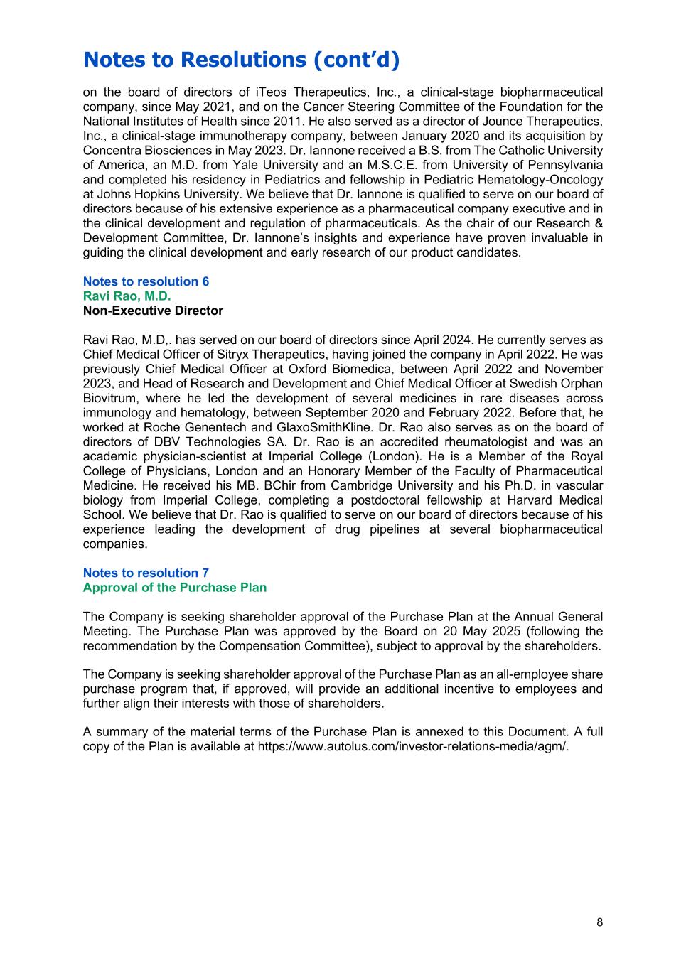 Notes to Resolutions (cont’d) 8 on the board of directors of iTeos Therapeutics, Inc., a clinical-stage biopharmaceutical company, since May 2021, and on the Cancer Steering Committee of the Foundation for the National Institutes of Health since 2011. He also served as a director of Jounce Therapeutics, Inc., a clinical-stage immunotherapy company, between January 2020 and its acquisition by Concentra Biosciences in May 2023. Dr. Iannone received a B.S. from The Catholic University of America, an M.D. from Yale University and an M.S.C.E. from University of Pennsylvania and completed his residency in Pediatrics and fellowship in Pediatric Hematology-Oncology at Johns Hopkins University. We believe that Dr. Iannone is qualified to serve on our board of directors because of his extensive experience as a pharmaceutical company executive and in the clinical development and regulation of pharmaceuticals. As the chair of our Research & Development Committee, Dr. Iannone’s insights and experience have proven invaluable in guiding the clinical development and early research of our product candidates. Notes to resolution 6 Ravi Rao, M.D. Non-Executive Director Ravi Rao, M.D,. has served on our board of directors since April 2024. He currently serves as Chief Medical Officer of Sitryx Therapeutics, having joined the company in April 2022. He was previously Chief Medical Officer at Oxford Biomedica, between April 2022 and November 2023, and Head of Research and Development and Chief Medical Officer at Swedish Orphan Biovitrum, where he led the development of several medicines in rare diseases across immunology and hematology, between September 2020 and February 2022. Before that, he worked at Roche Genentech and GlaxoSmithKline. Dr. Rao also serves as on the board of directors of DBV Technologies SA. Dr. Rao is an accredited rheumatologist and was an academic physician-scientist at Imperial College (London). He is a Member of the Royal College of Physicians, London and an Honorary Member of the Faculty of Pharmaceutical Medicine. He received his MB. BChir from Cambridge University and his Ph.D. in vascular biology from Imperial College, completing a postdoctoral fellowship at Harvard Medical School. We believe that Dr. Rao is qualified to serve on our board of directors because of his experience leading the development of drug pipelines at several biopharmaceutical companies. Notes to resolution 7 Approval of the Purchase Plan The Company is seeking shareholder approval of the Purchase Plan at the Annual General Meeting. The Purchase Plan was approved by the Board on 20 May 2025 (following the recommendation by the Compensation Committee), subject to approval by the shareholders. The Company is seeking shareholder approval of the Purchase Plan as an all-employee share purchase program that, if approved, will provide an additional incentive to employees and further align their interests with those of shareholders. A summary of the material terms of the Purchase Plan is annexed to this Document. A full copy of the Plan is available at https://www.autolus.com/investor-relations-media/agm/.